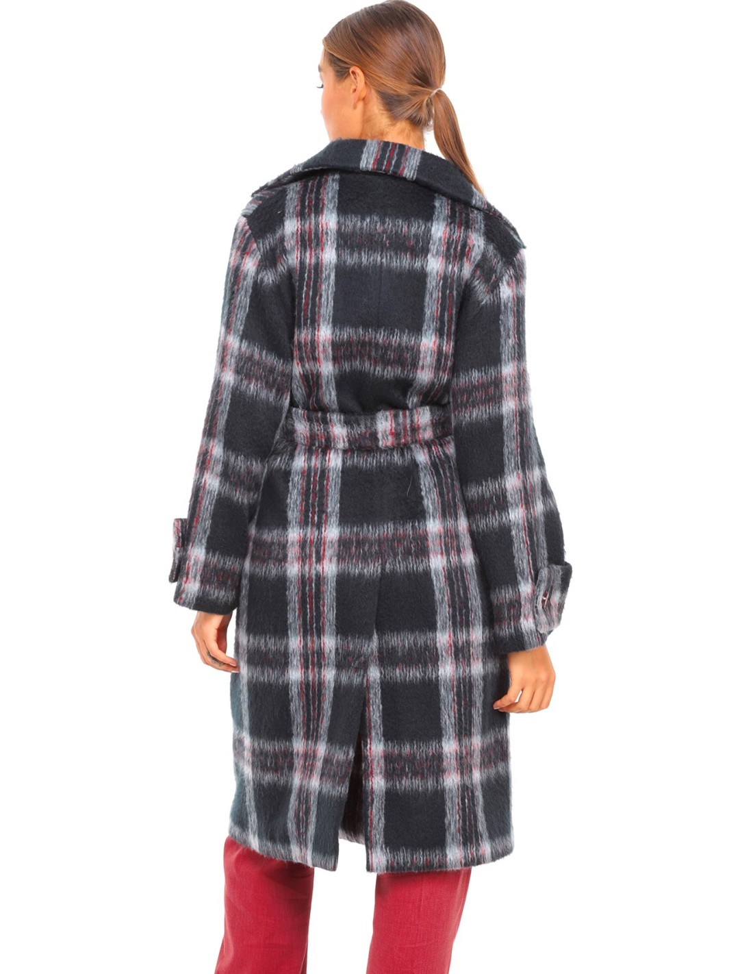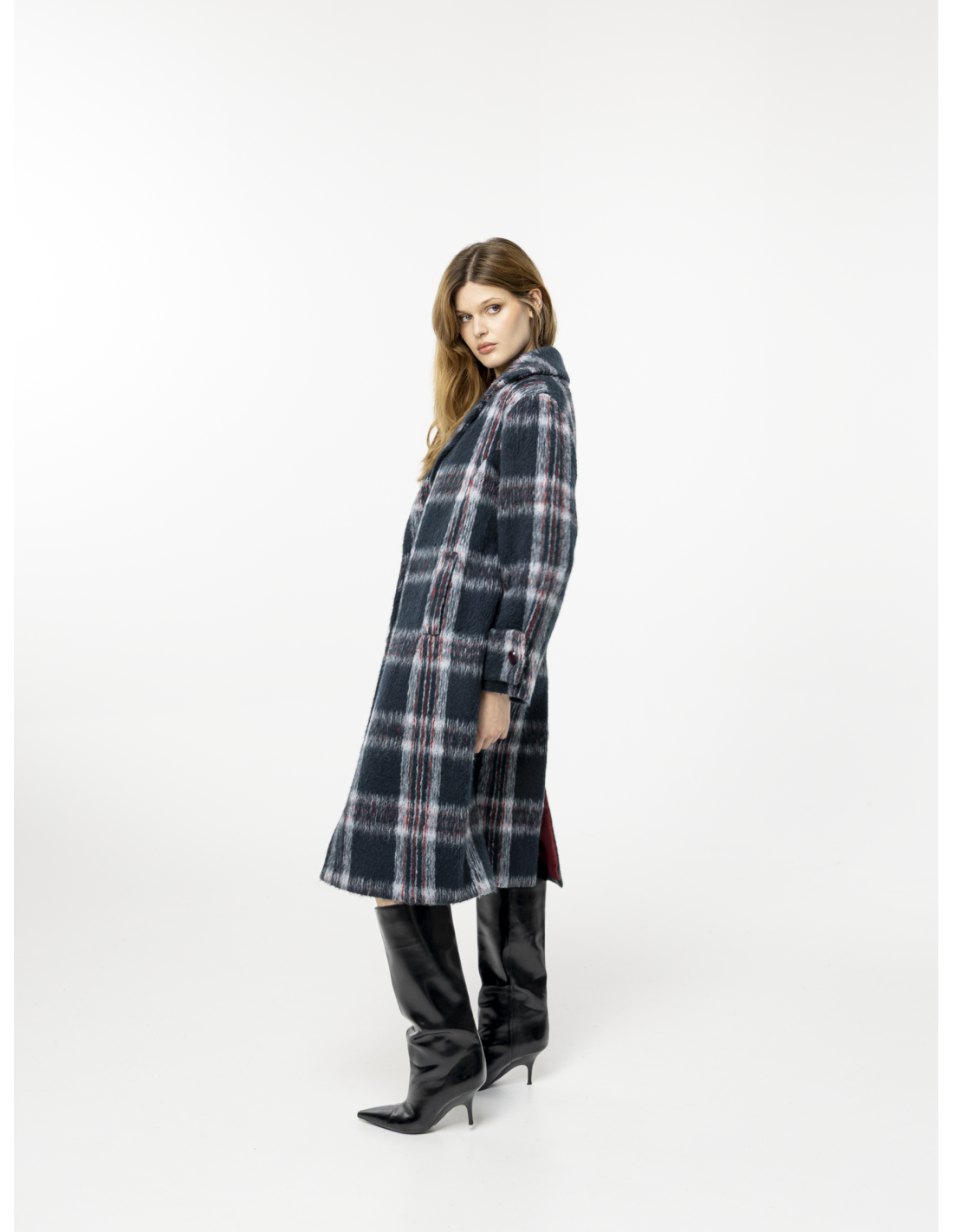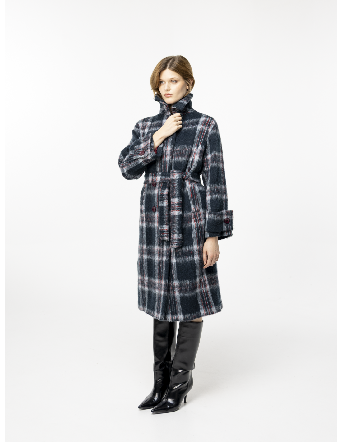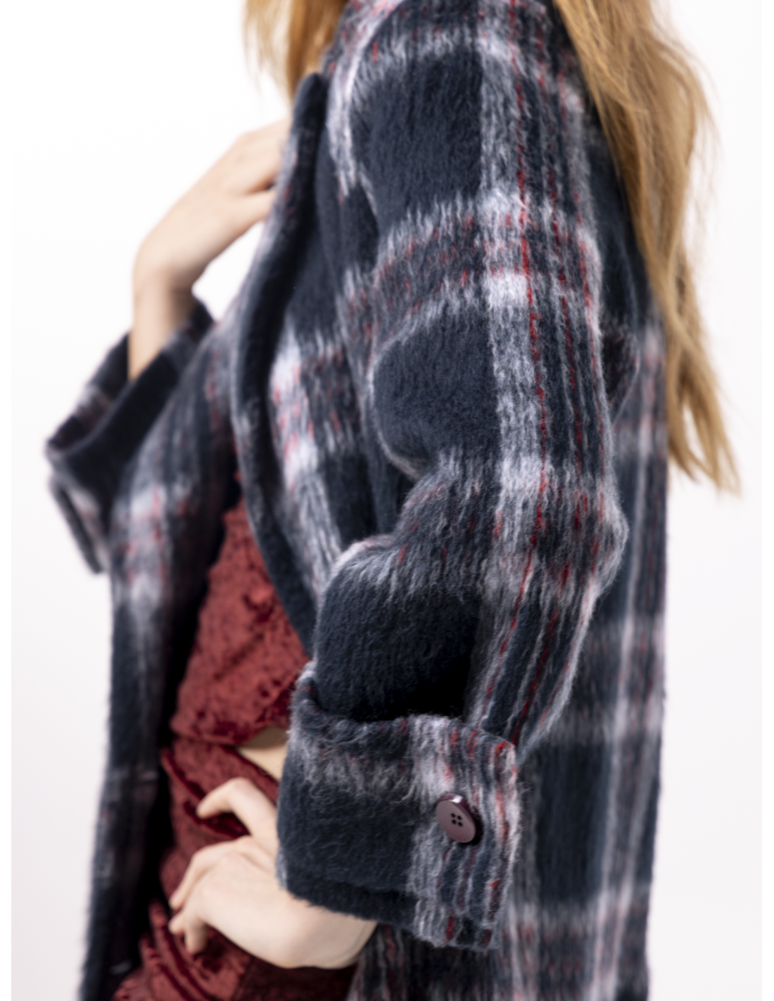 The checked straight coat draws a fluid, enveloping silhouette where black, white, and red interlace with elegance.