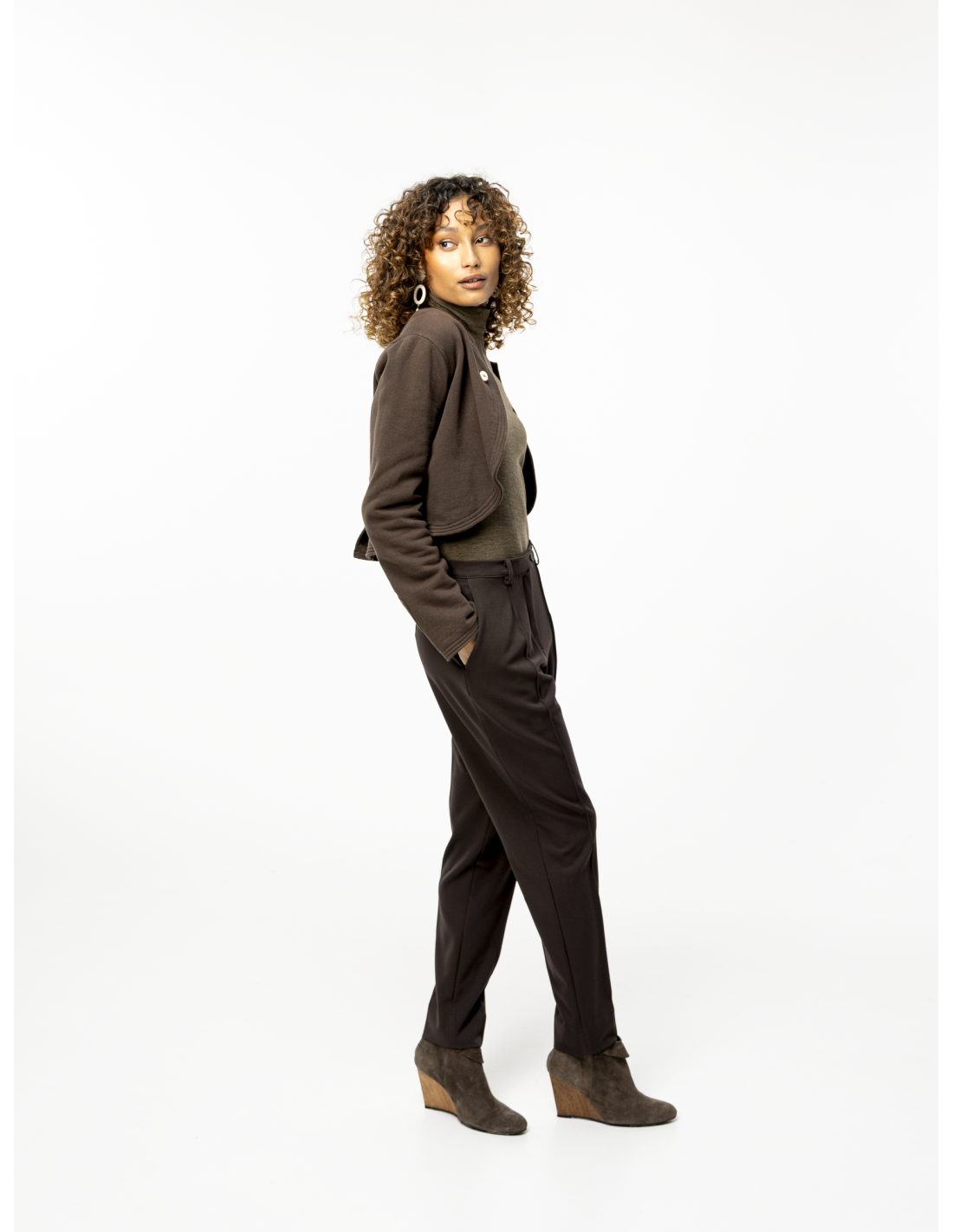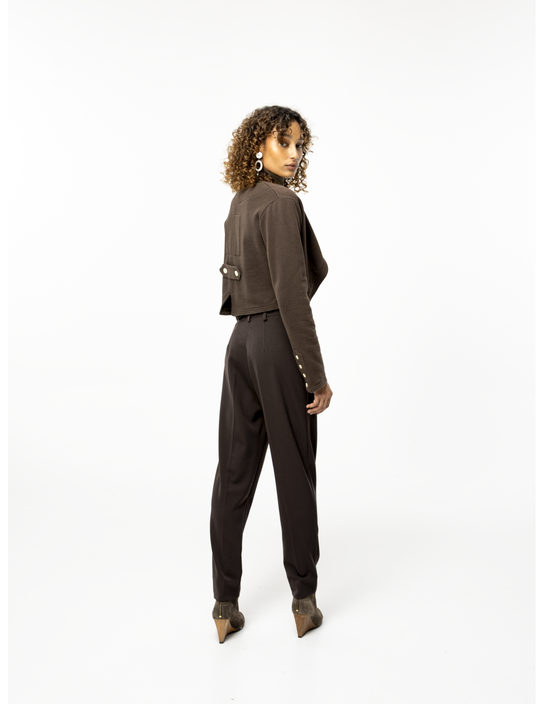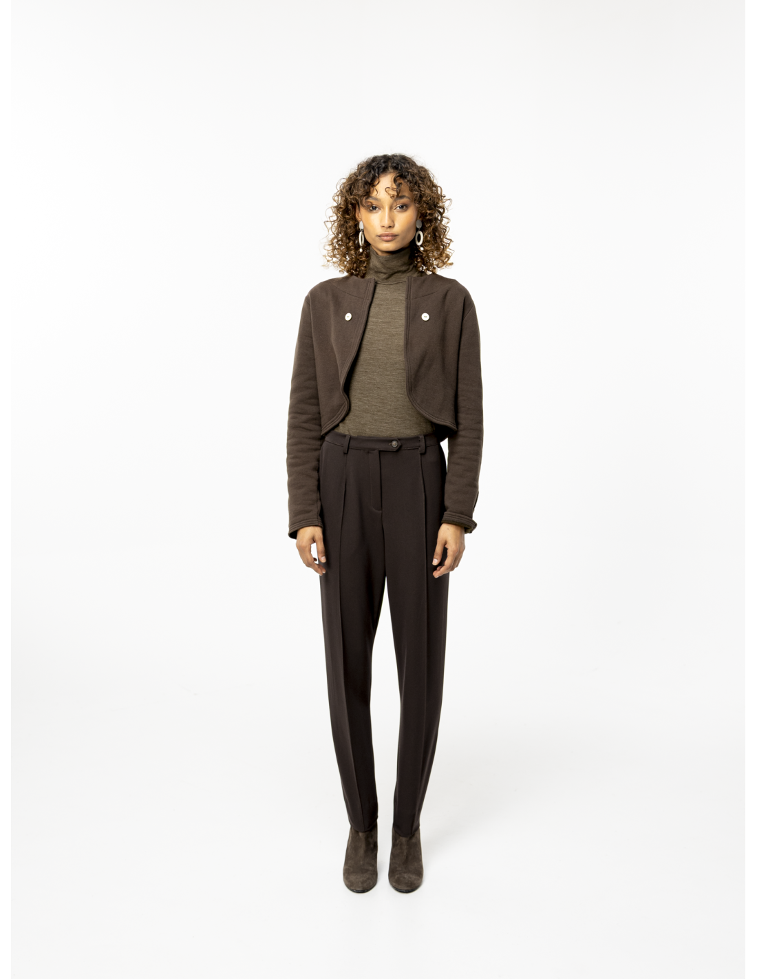 The cropped mocha cotton cardigan stands out as a casual-chic piece with a modern, refined allure. Its bolero-inspired, open-front cut highlights the silhouette while allowing a sense of effortless fluidity. Decorative buttons and precise topstitching bring subtle sophistication, while its 100% cotton knit makes it a warm and comfortable everyday ally.
