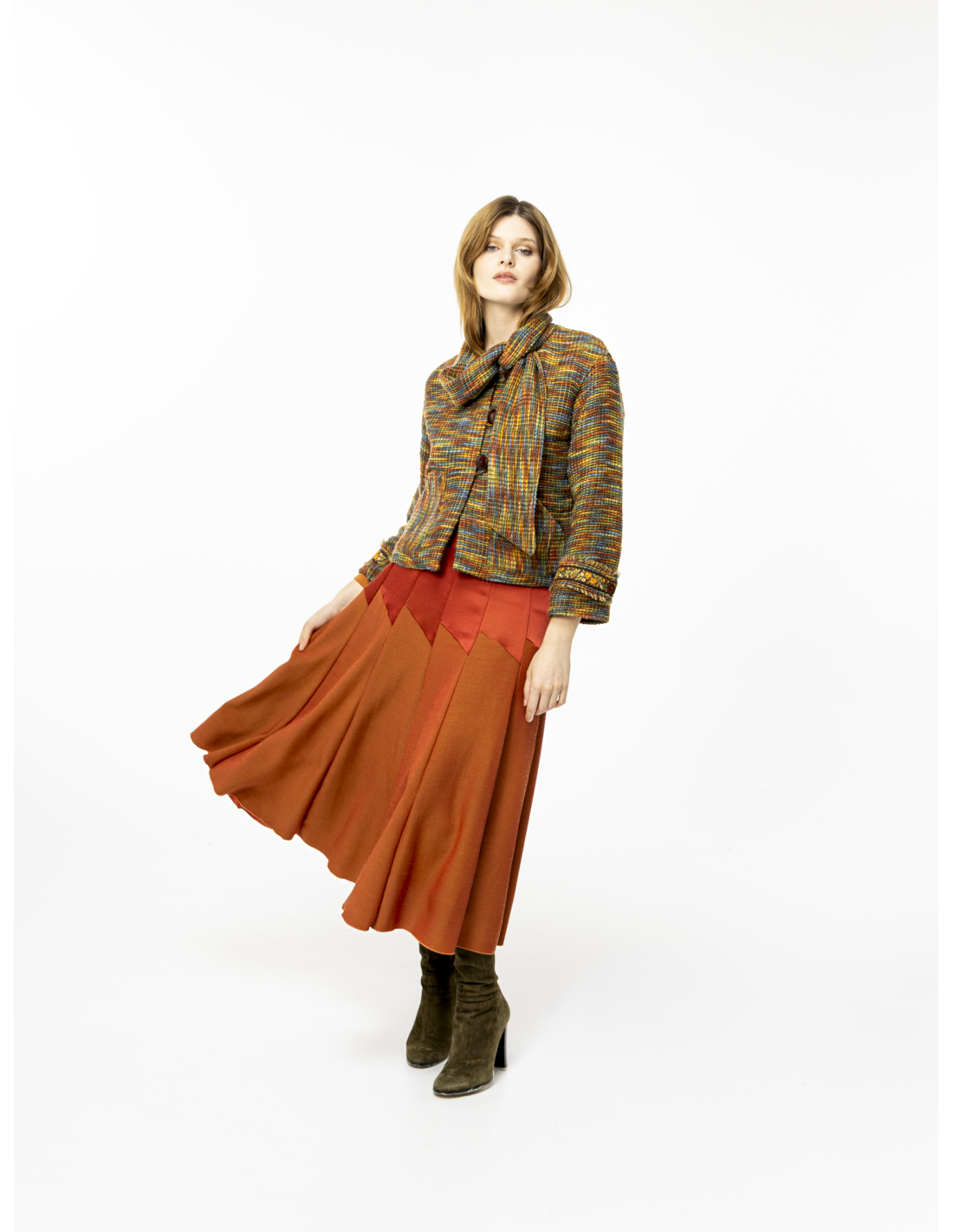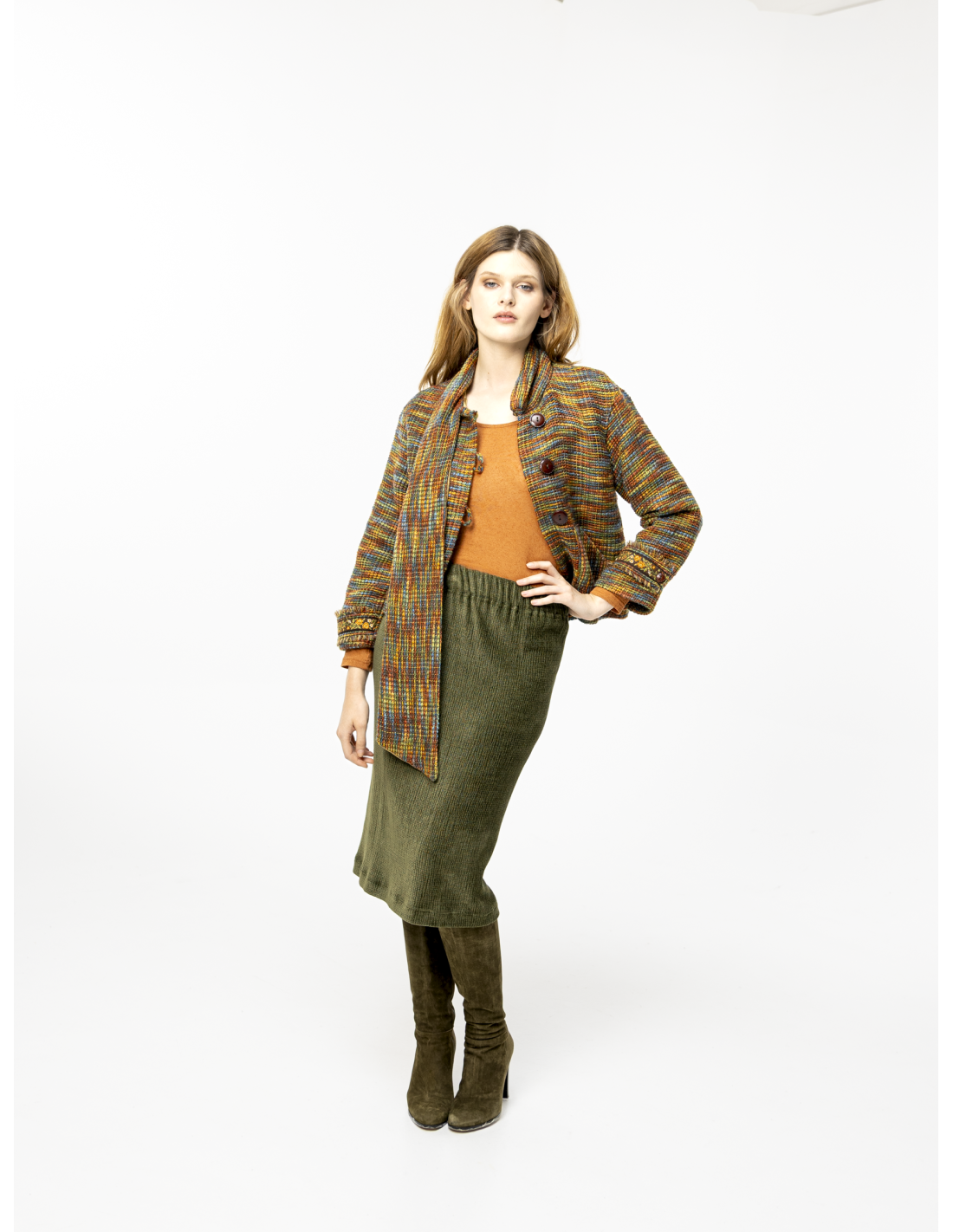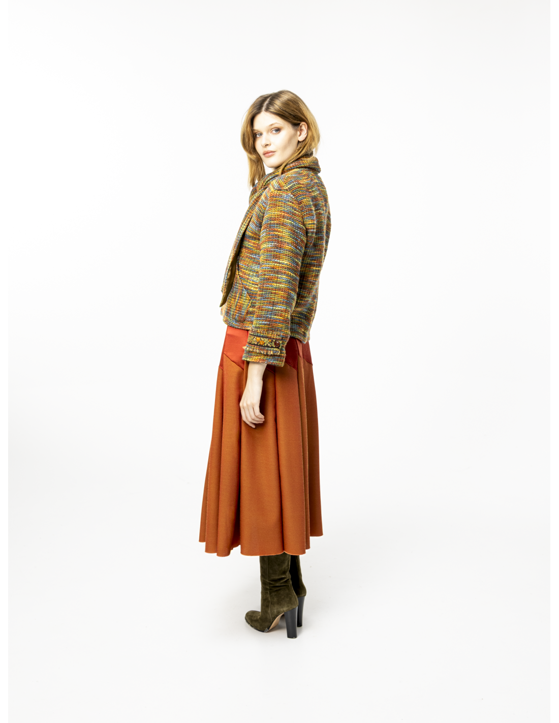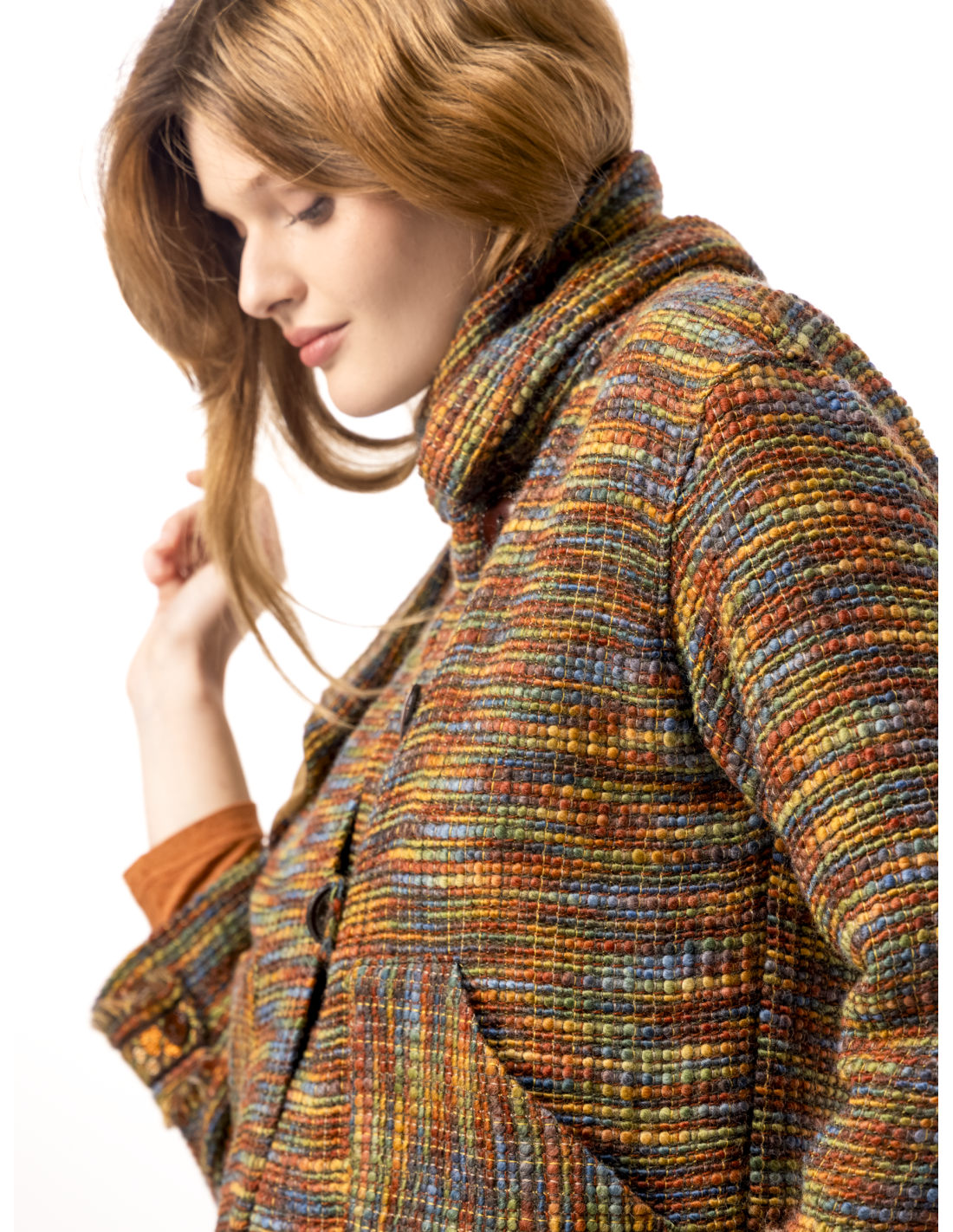 The Suzy jacket embodies Parisian chic revisited for fall-winter. Crafted from multicolored tweed in warm shades of rust, blue, green, and yellow, it plays on a graphic and contemporary look. Its straight cut, punctuated by large wooden buttons and a stand-up collar with an integrated scarf, brings a blend of elegant casualness and natural sophistication. Refined details, such as buttoned cuffs highlighted with floral braiding, accentuate its character. With its fluid and comfortable silk lining, this jacket is the perfect ally for a bold silhouette that is both urban and modern.