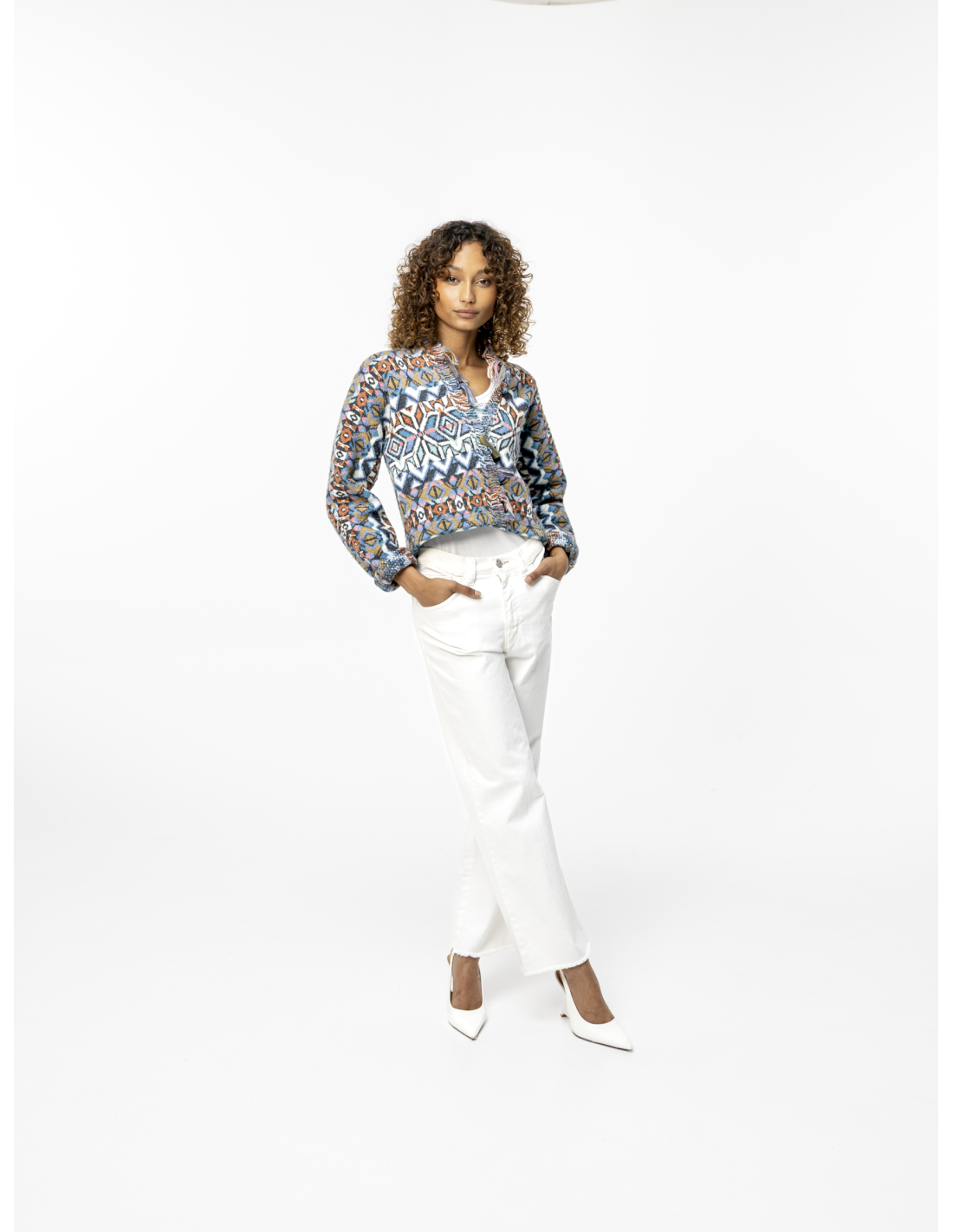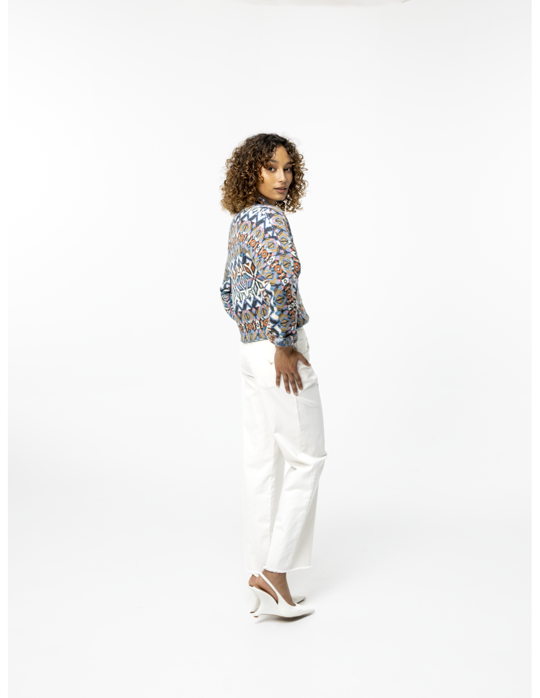 The Blanche cardigan stands out with its colorful jacquard pattern and cozy feel. Crafted in Italy, it combines the natural warmth of wool with a touch of cotton for added comfort and breathability. With its cropped cut and refined details, it is a statement piece that elevates a simple outfit or completes a bolder look.