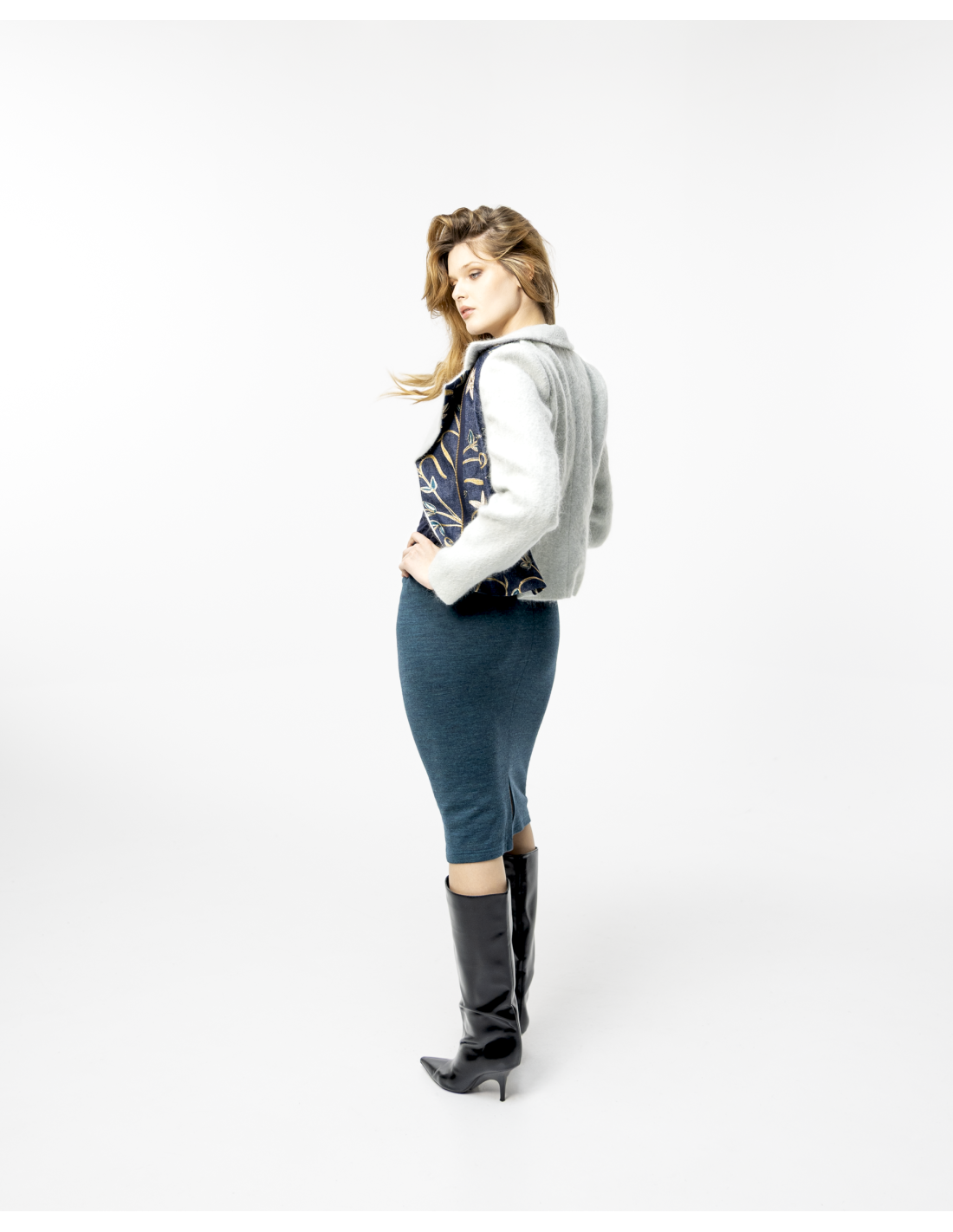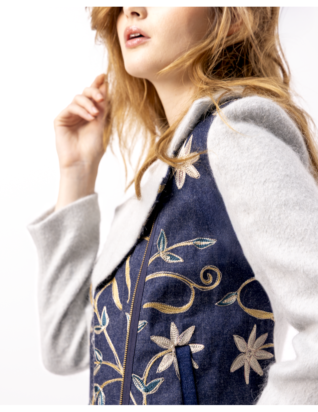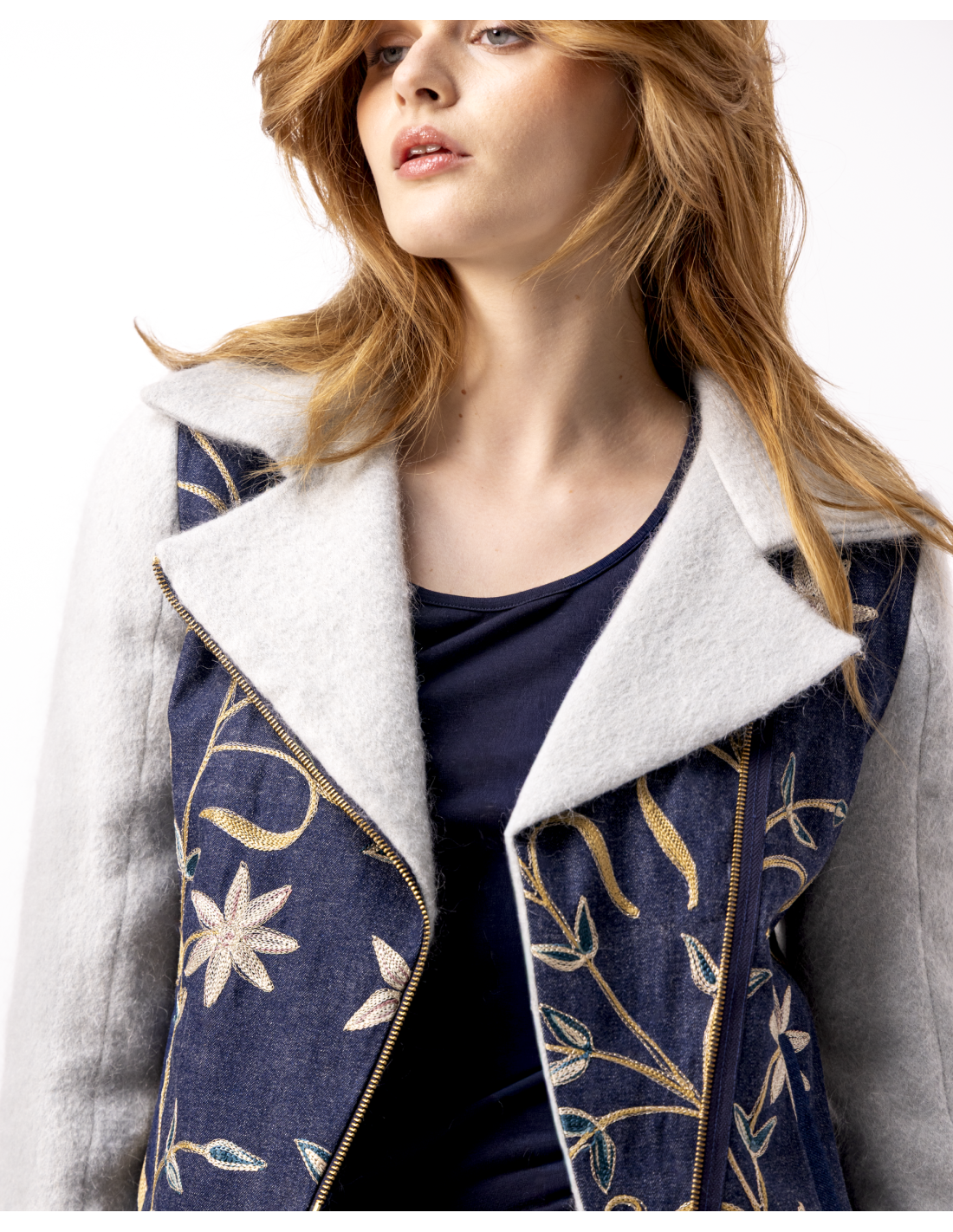 This Melanie Perfecto jacket in embroidered denim and mohair captivates with its refined combination of materials and luminous embroidery. Combining modernity and artisanal craftsmanship, it adds a bold and elegant touch to your seasonal outfits.