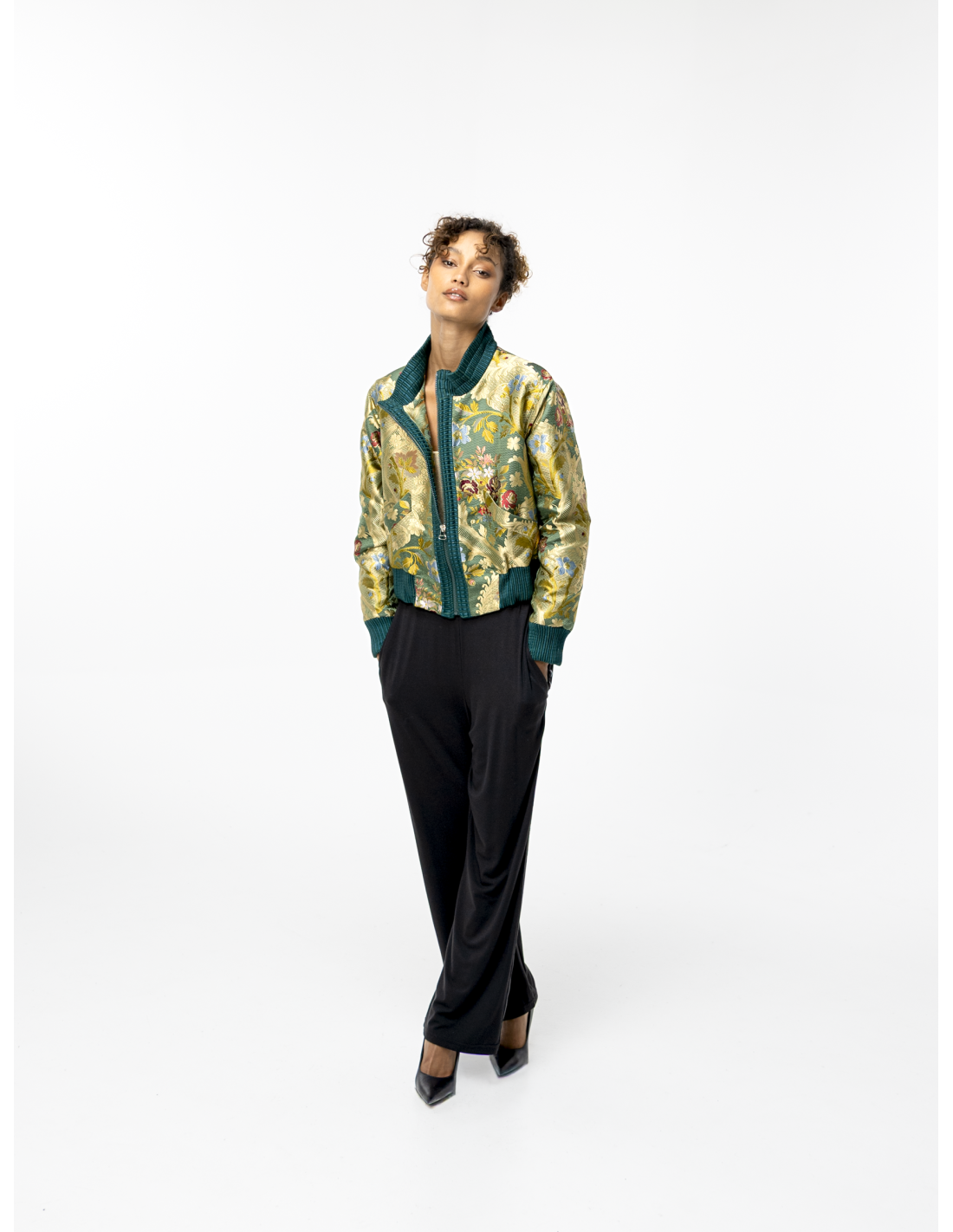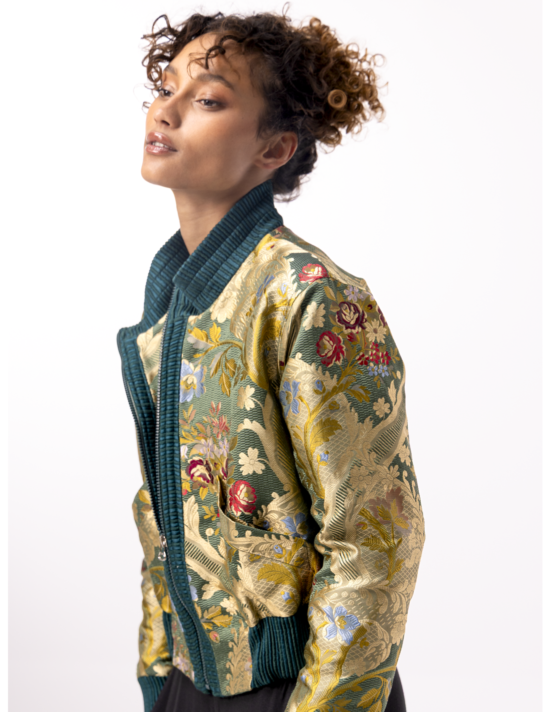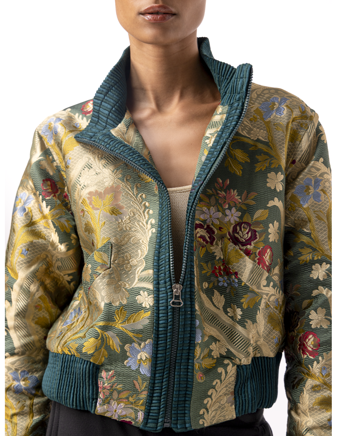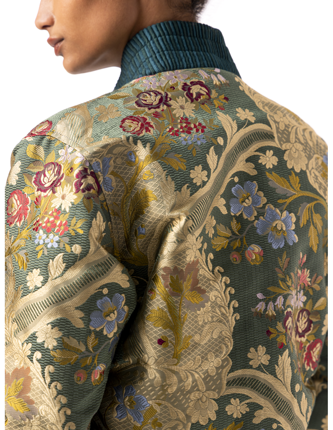 Emerald green silk brocade jacket with gold highlights and tapestry-inspired motifs. An exceptional piece, made in Italy, which revisits the bomber jacket with style and sophistication to enhance any silhouette