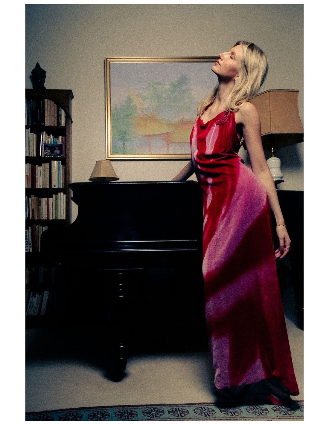 A sculptural dress in two-tone velvet that combines glamour, sensuality, and exceptional craftsmanship.
