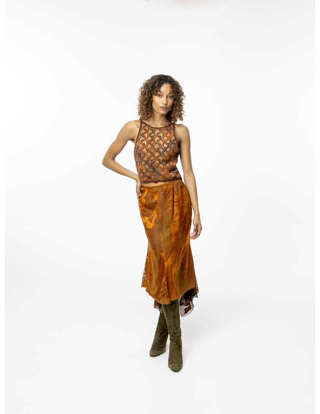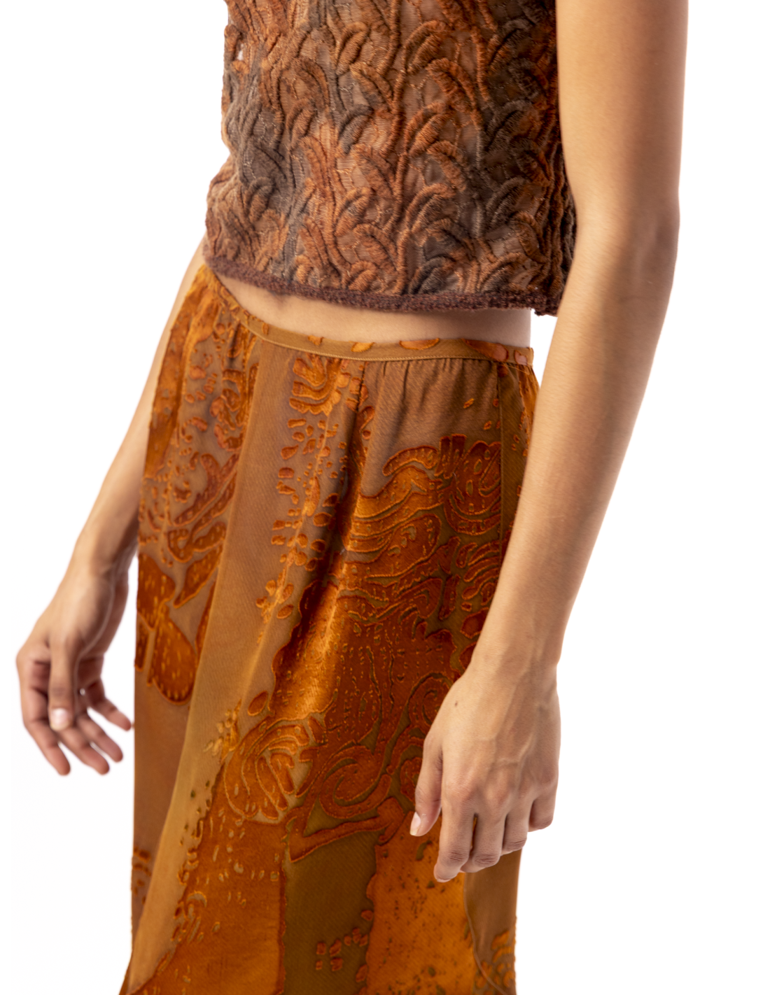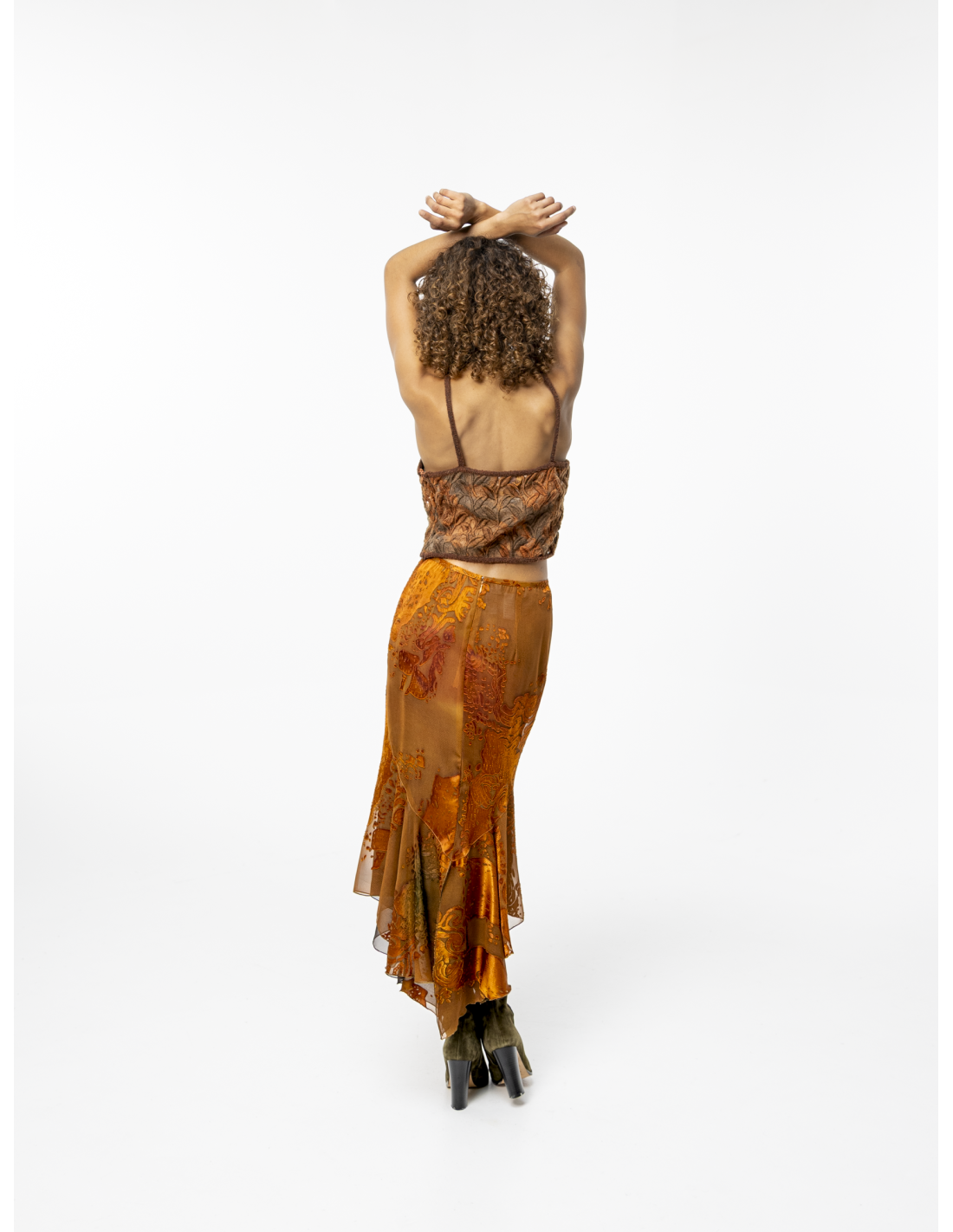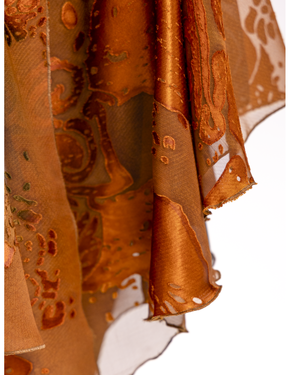 Crafted from precious copper-colored devoré silk, it combines timeless refinement with subtle sensuality.