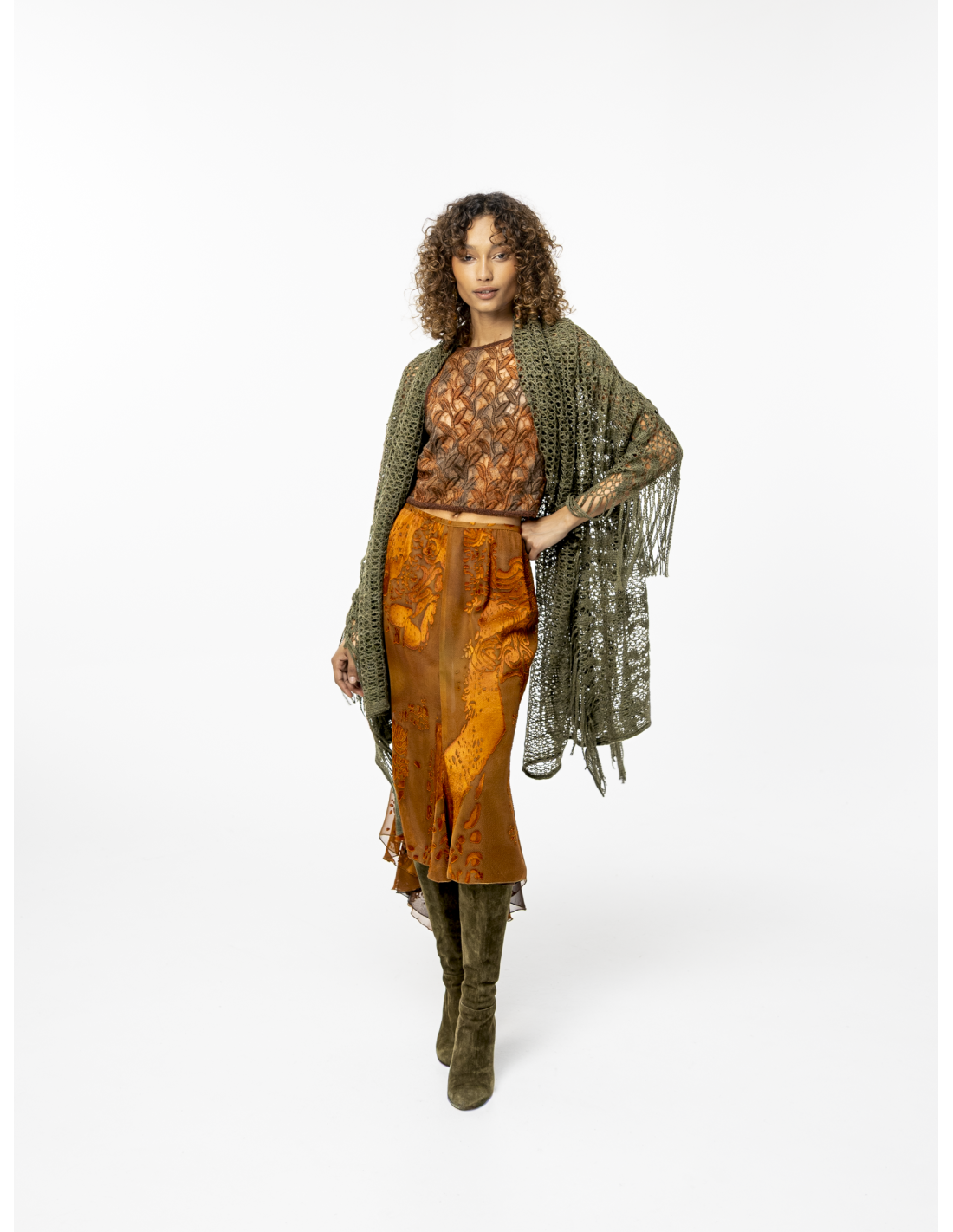 The Seila skirt reveals an airy, couture elegance, enhanced by a flowing mermaid-style cut and vibrant movements that capture the light.