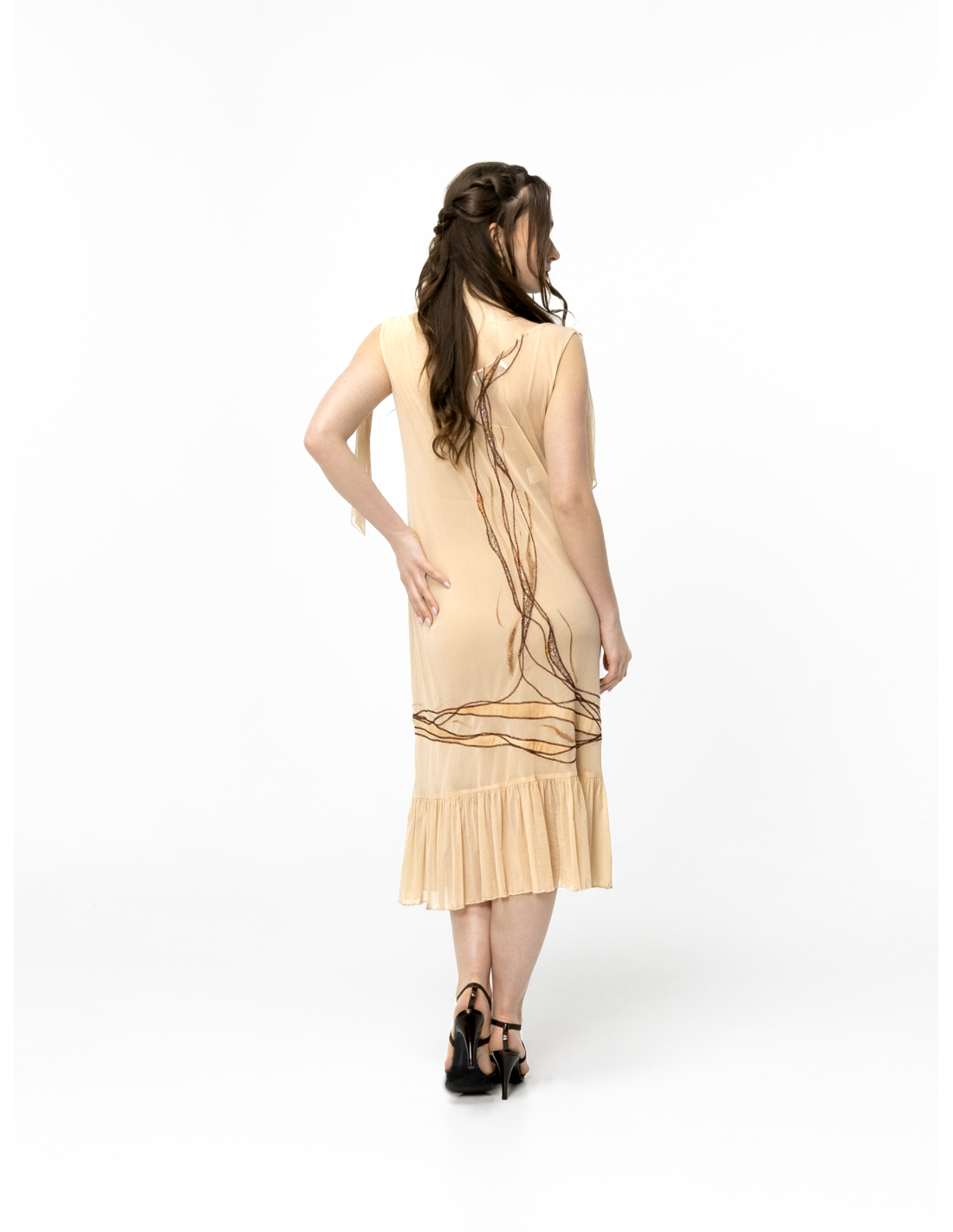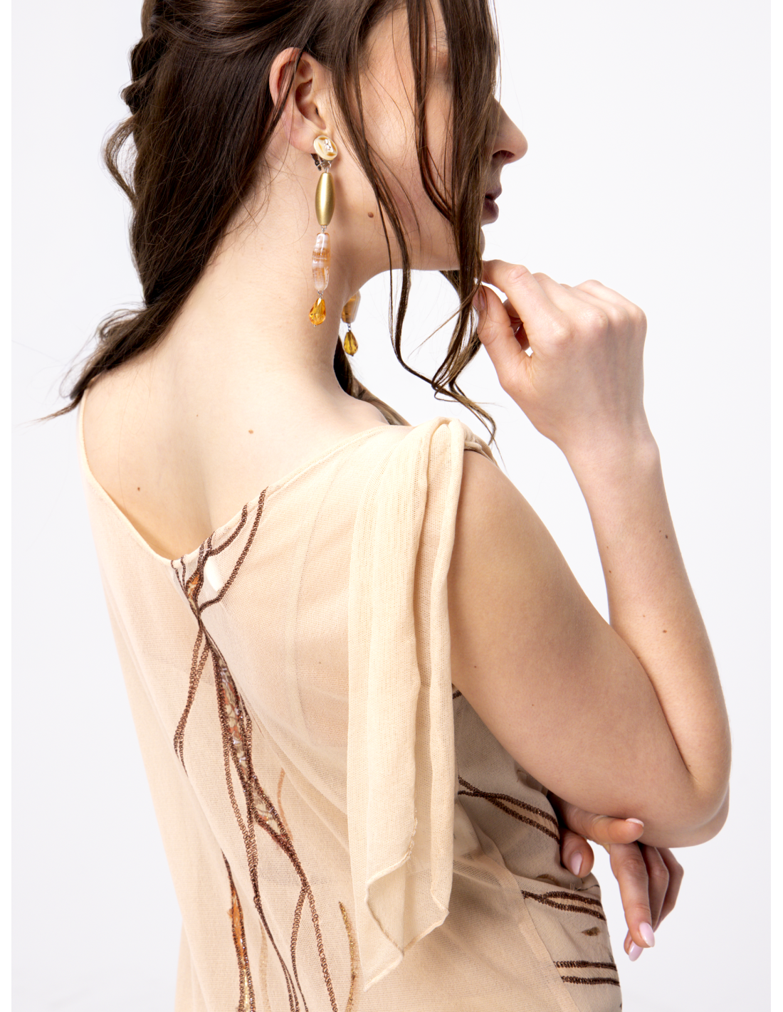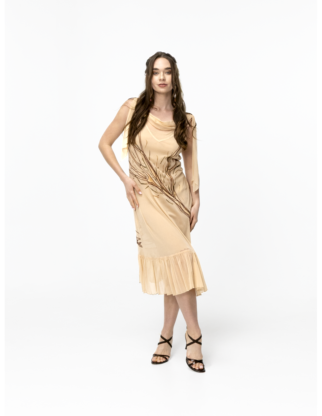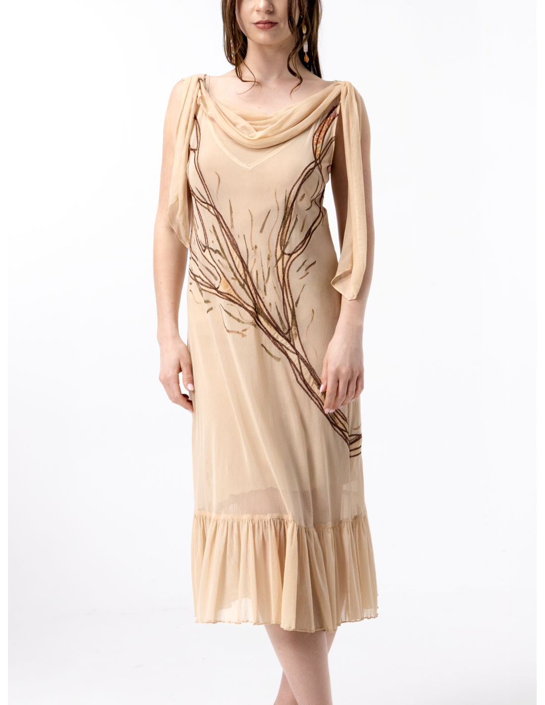 A sensual silhouette in powder pink tulle, embroidered with a tree of life motif and delicately painted on the front and back, designed as an ethereal piece that captures movement. The cowl neckline, featuring a stole-like effect at the front and a V-neck at the back, elongates the silhouette with natural elegance, while the A-line cut offers a sinuous, flowing drape.