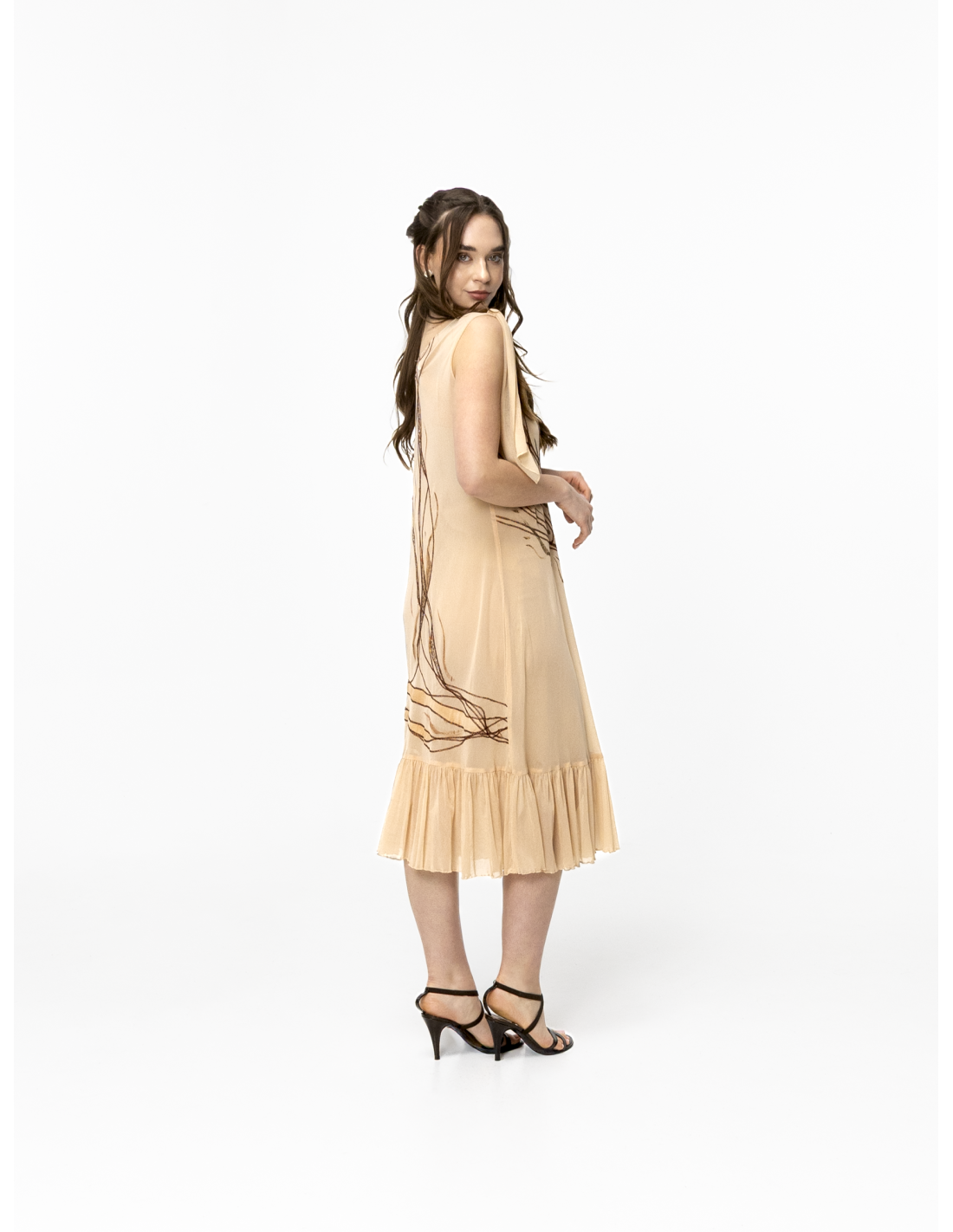 The bottom of the dress flares out into a large ruffle, evoking a light, almost dancing gesture.