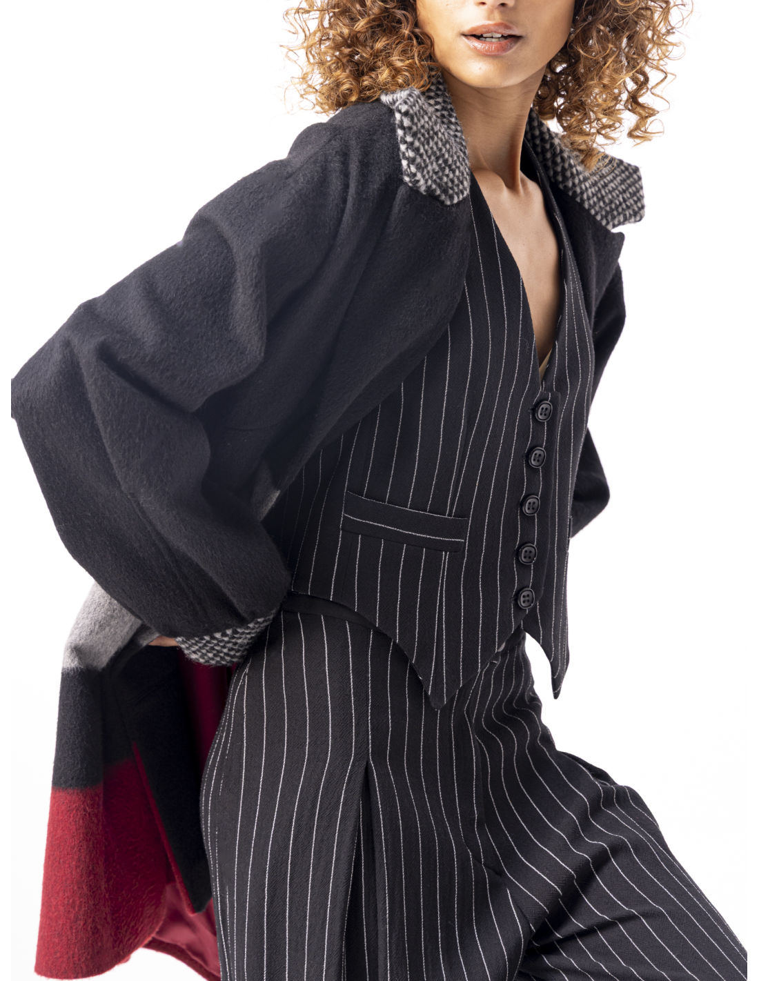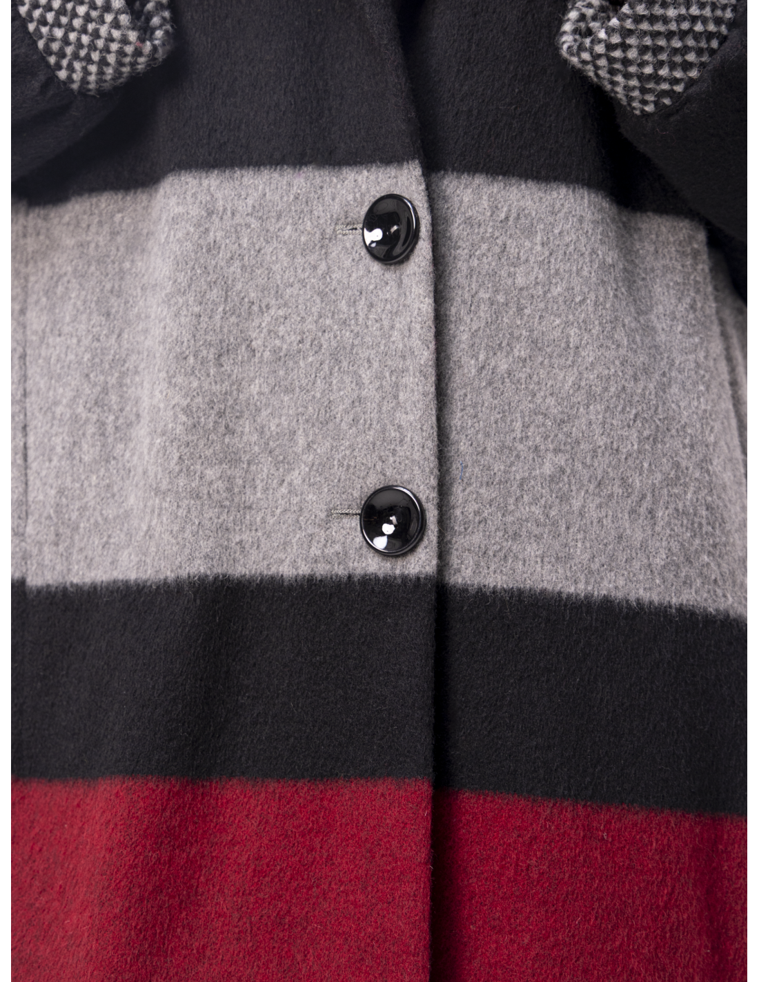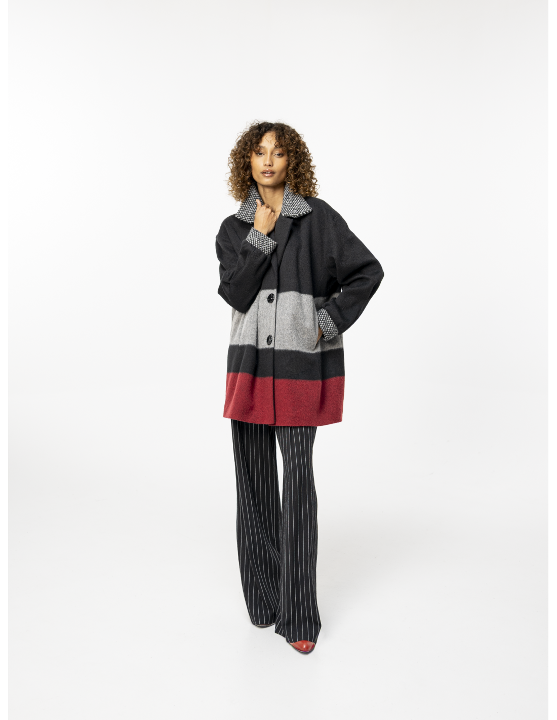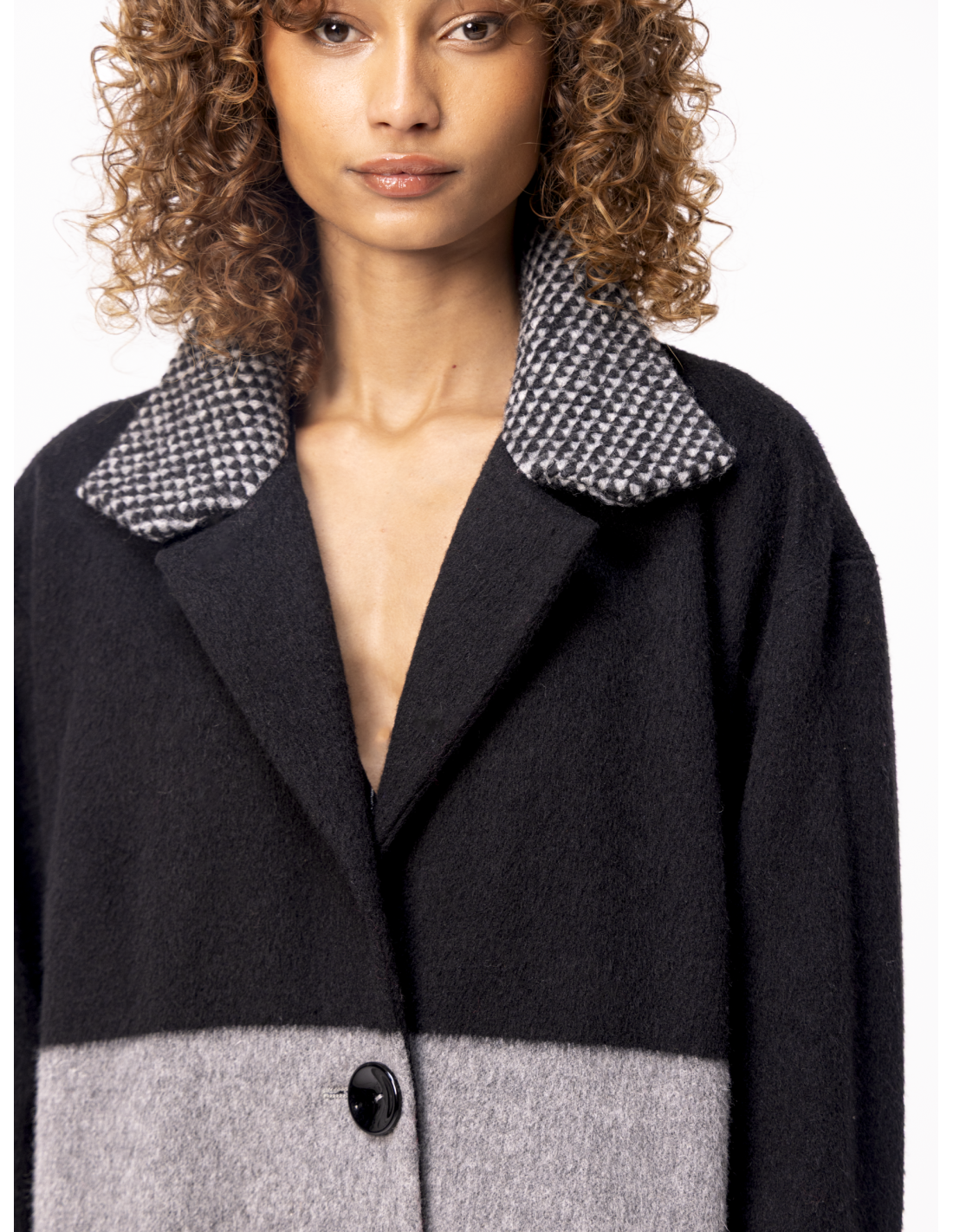 The mid-length striped wool coat blends the elegance of a straight cut with the modern touch of knitted details. Its slightly dropped shoulders and knitted tailored collar create a sporty chic style, combining comfort and refinement. With its two glossy black buttons and front patch pockets, this timeless piece is warm, versatile, and perfect for everyday wear.