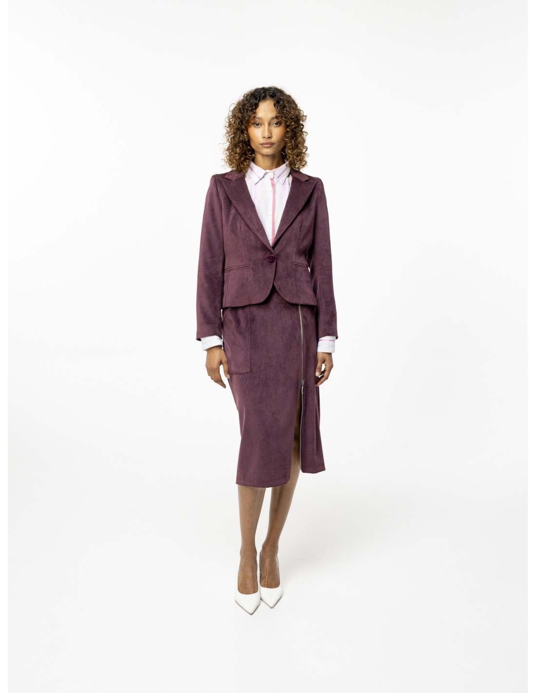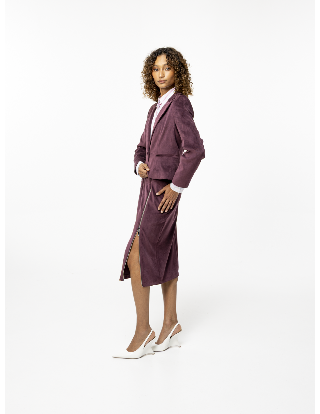 The Cloé skirt, a straight design in eco-suede, available in plum or blue, charms with its clean line and casual-trendy spirit.