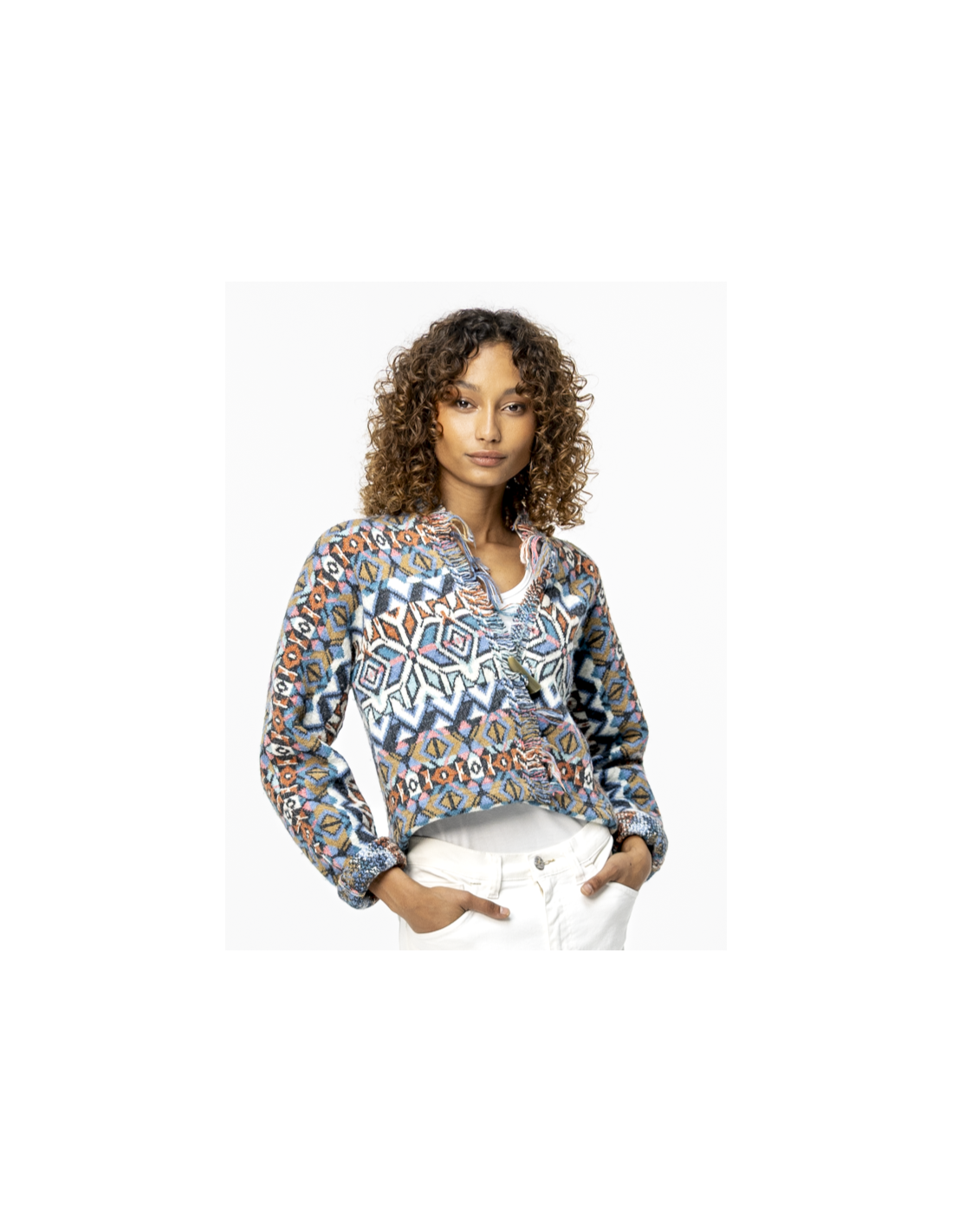 Le cardigan Blanche séduit par son motif jacquard coloré et son allure chaleureuse. Confectionné en Italie, il associe la douceur de la laine à une pointe de coton pour un confort naturel et respirant. Sa coupe courte et ses détails raffinés en font une pièce forte du vestiaire, idéale pour dynamiser une tenue sobre ou compléter un look plus audacieux.