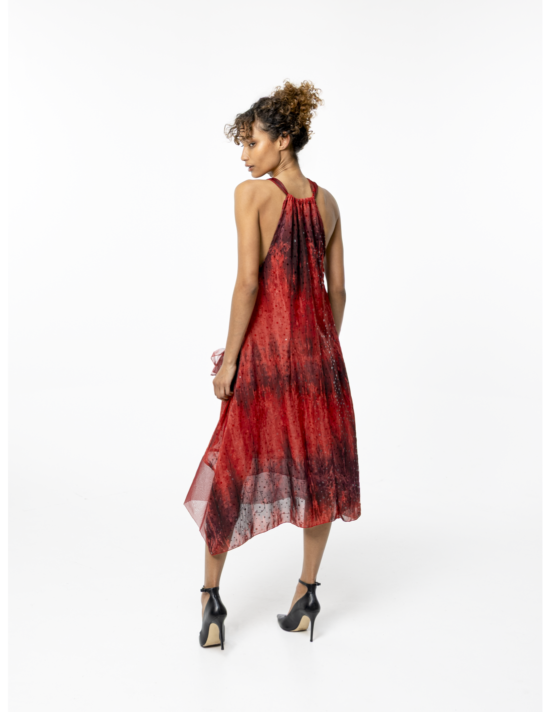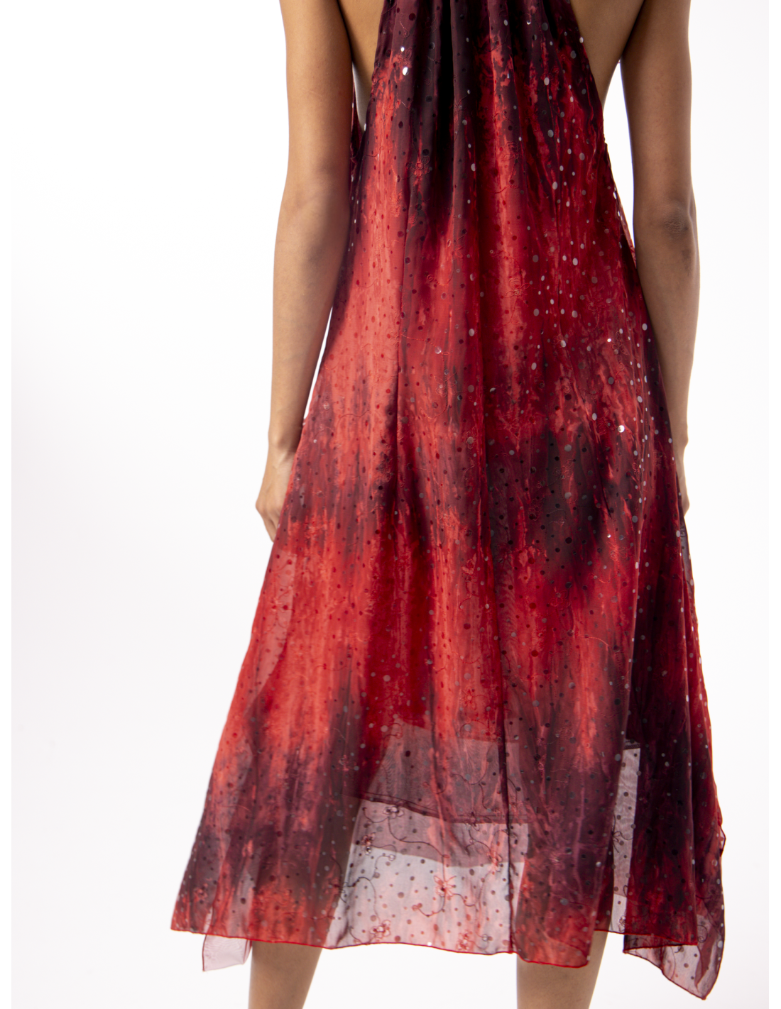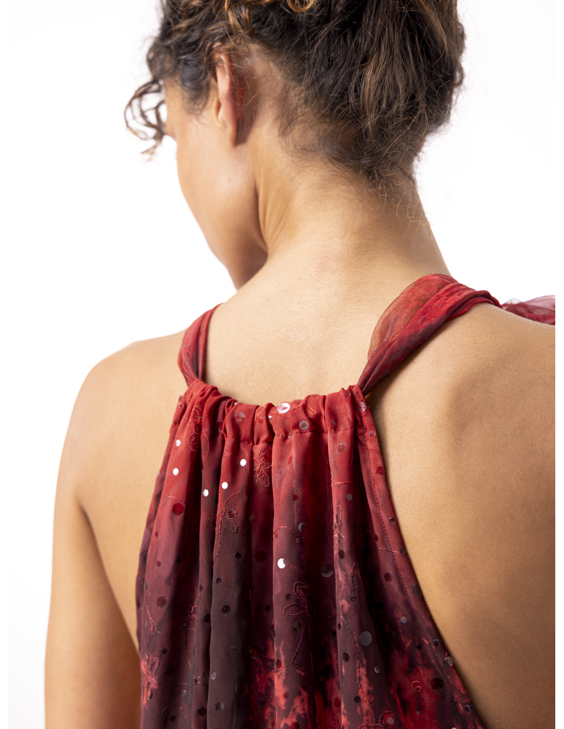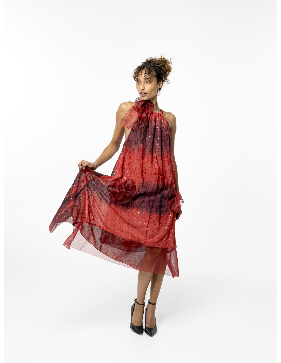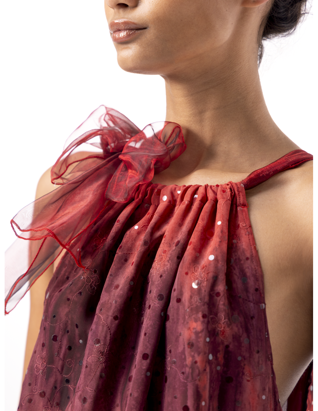 La robe fluide rouge Ciara se déploie telle une ode à la féminité, sublimée par un rouge profond aux reflets scintillants. Confectionnée dans une soie aérienne pailletée , elle révèle une transparence délicate et une fluidité précieuse qui accompagnent chaque mouvement. Son encolure foulard en organza coordonné nouée à l’épaule, ses jeux de volume et ses détails raffinés apportent allure et intensité à la silhouette. Une création confortable et sophistiquée, pensée pour celles qui embrassent la grâce et la modernité avec naturel.