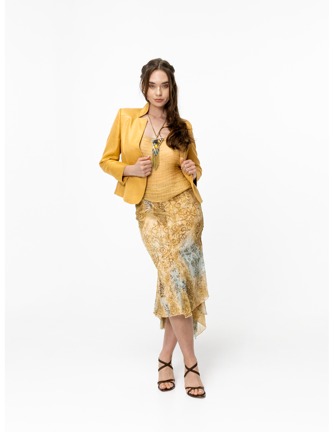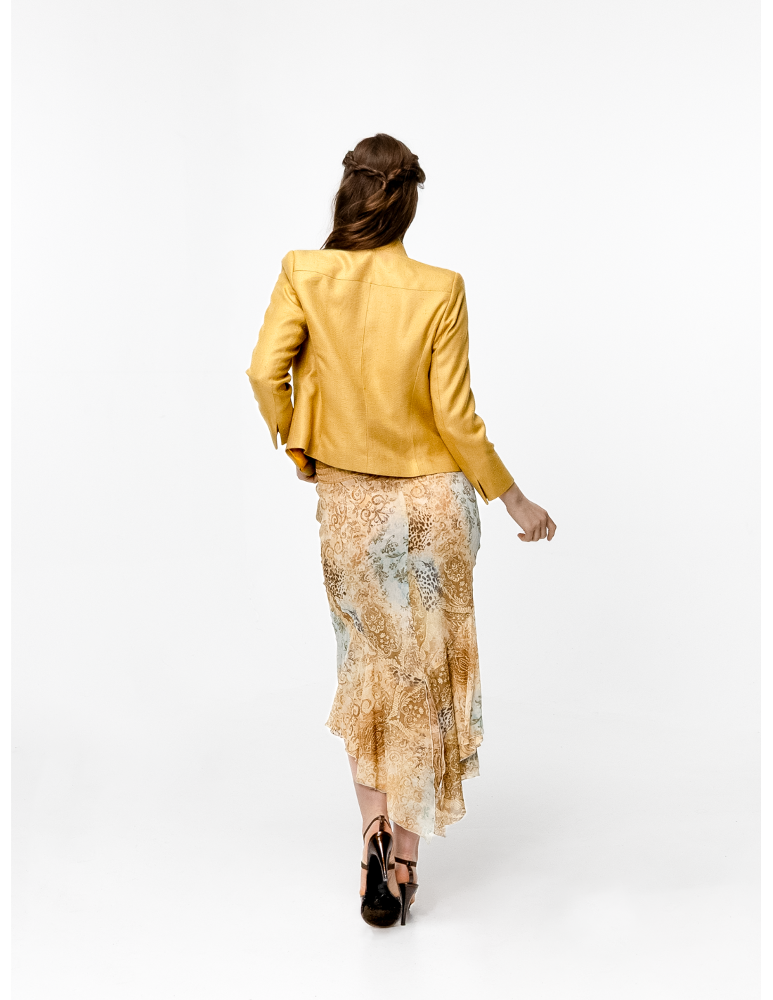 Fabriquée en Italie, cette veste en soie allie qualité, précision de coupe et harmonie de couleurs. Elle se porte facilement avec un pantalon tailleur ou une jupe crayon pour une silhouette élégante en journée, ou associée à la jupe sirène Seila en mousseline dorée pour un look plus glamour et sophistiqué.