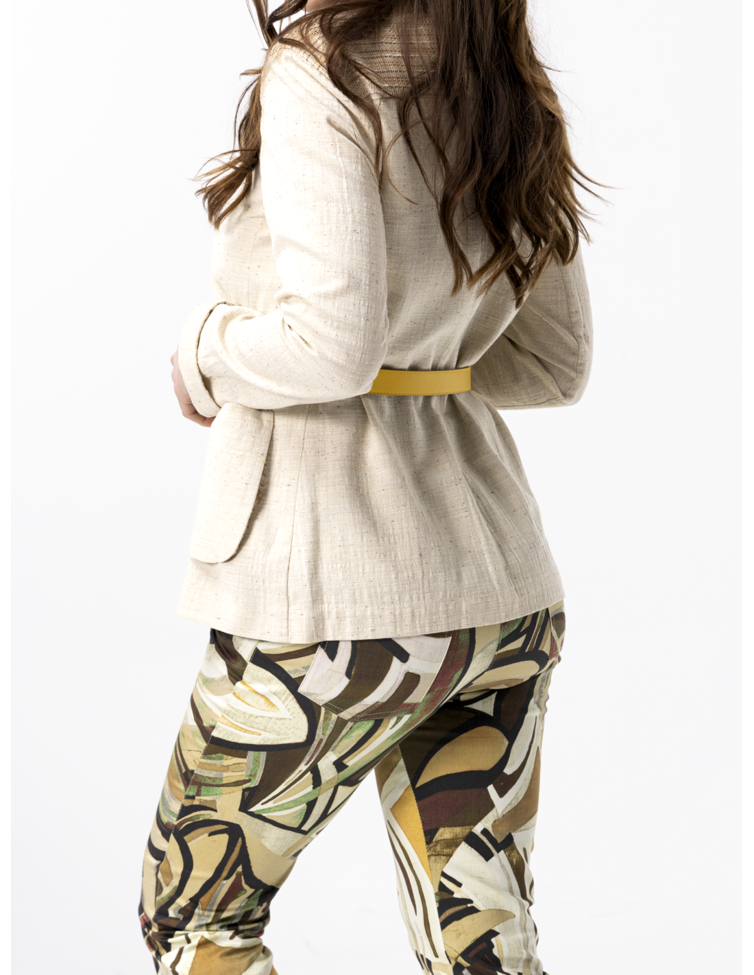 Apportez une touche de sophistication à votre dressing avec cette veste saharienne beige en coton et soie, à la fois légère, fluide et résolument moderne. Son design revisite un classique intemporel avec des détails en résille subtilement intégrés, pour un style chic et audacieux.