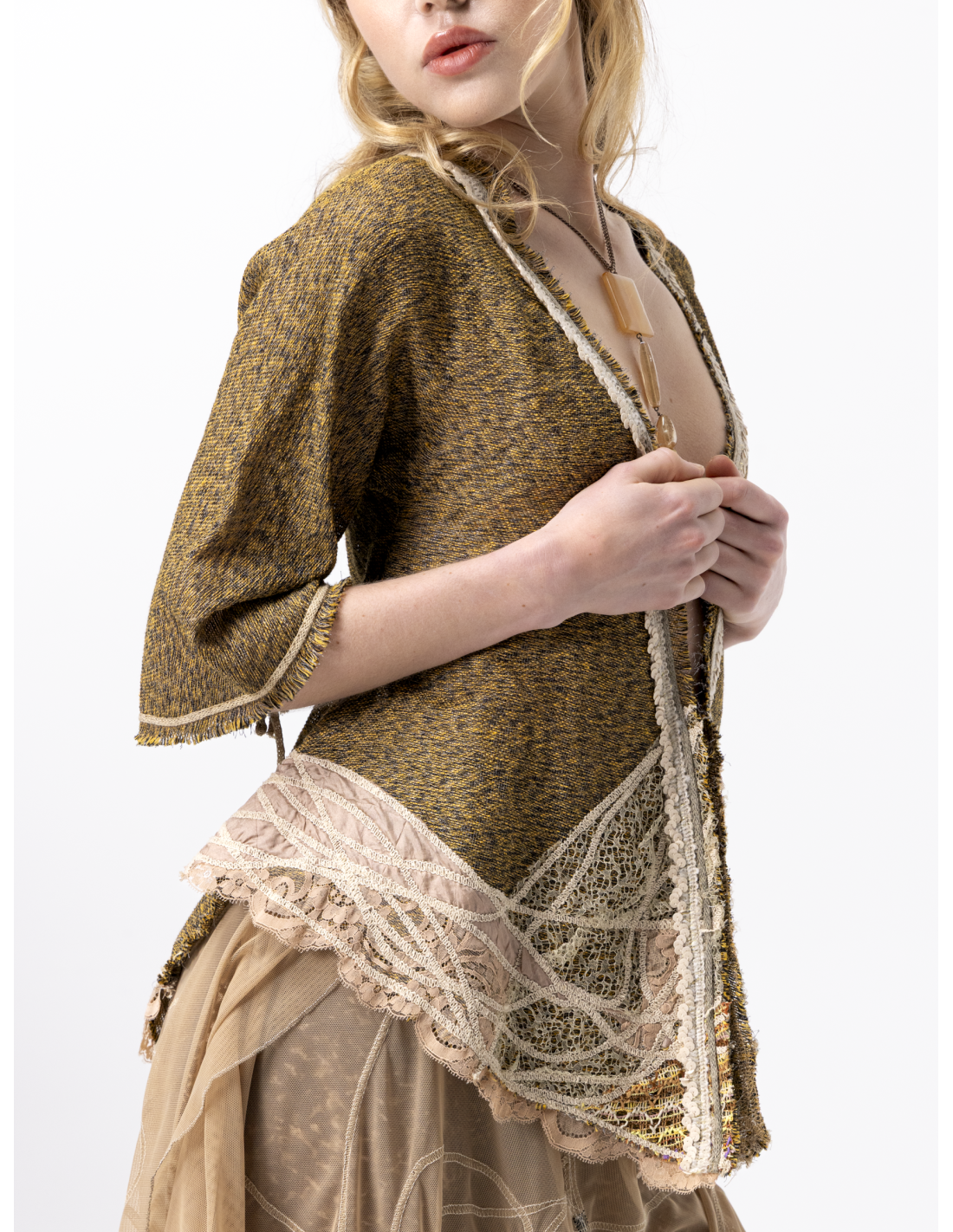 Confectionnée avec soin, cette veste sans col aux manches kimono 3/4 séduit par son mélange de matières nobles : une résille de lin et de soie chinée aux reflets mordorés, sublimée par de délicates broderies mêlant dentelle et soie rose poudré. Chaque détail révèle un savoir-faire artisanal et une attention particulière portée à la texture et à la lumière.