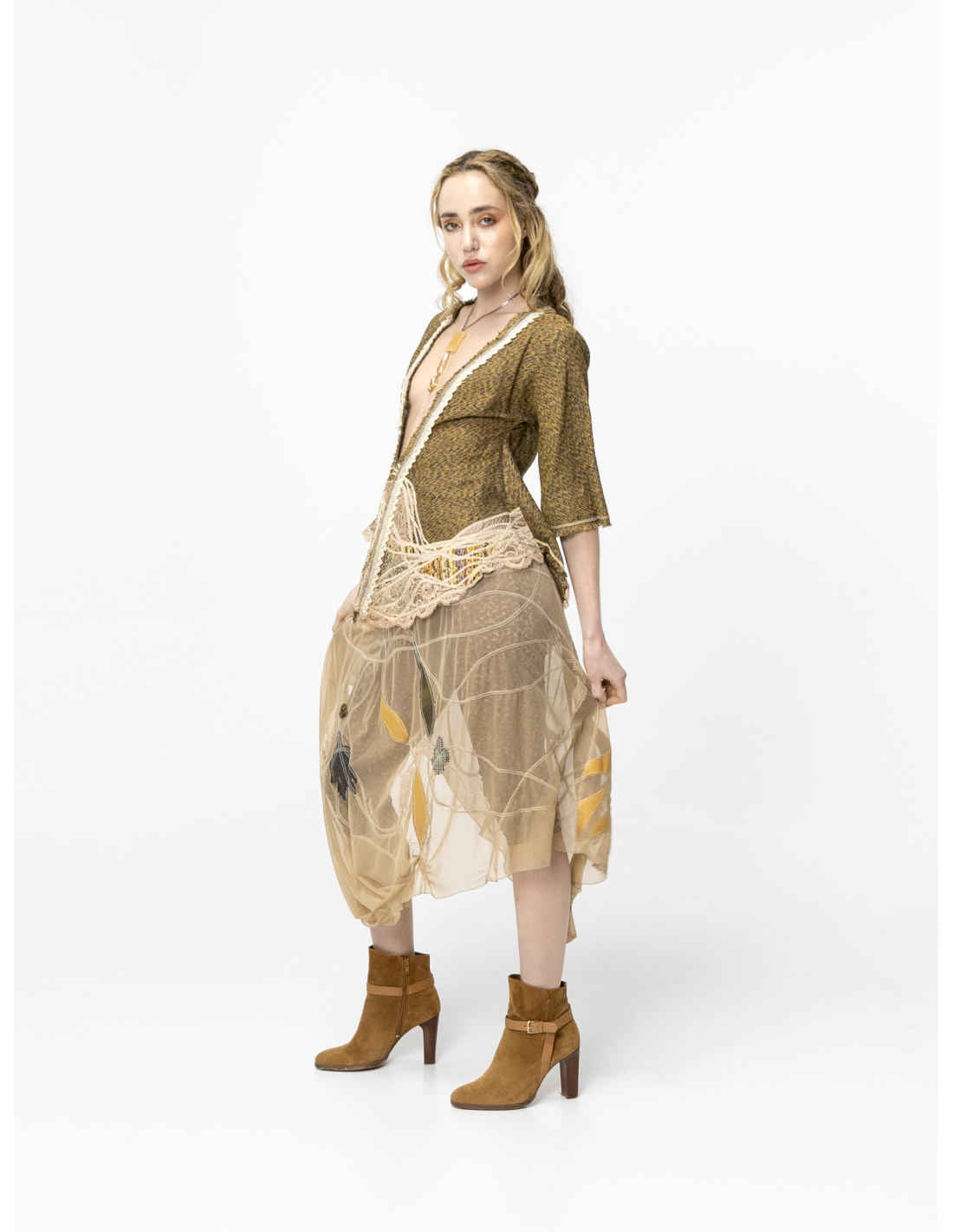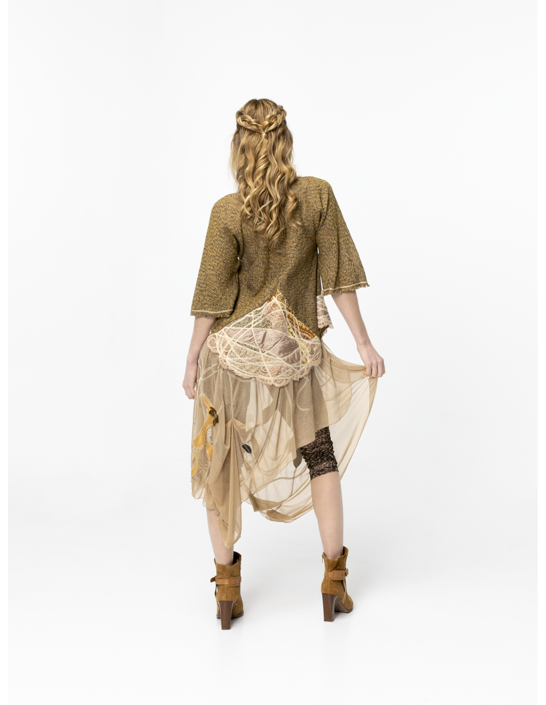 L’alliance des matières et la fluidité de la coupe offrent une silhouette à la fois poétique, ethnique et résolument sophistiquée. Cette pièce forte s’adapte à toutes vos envies : portée avec un total look ivoire pour une élégance lumineuse, ou associée à sa jupe et son legging pour un style plus affirmé .