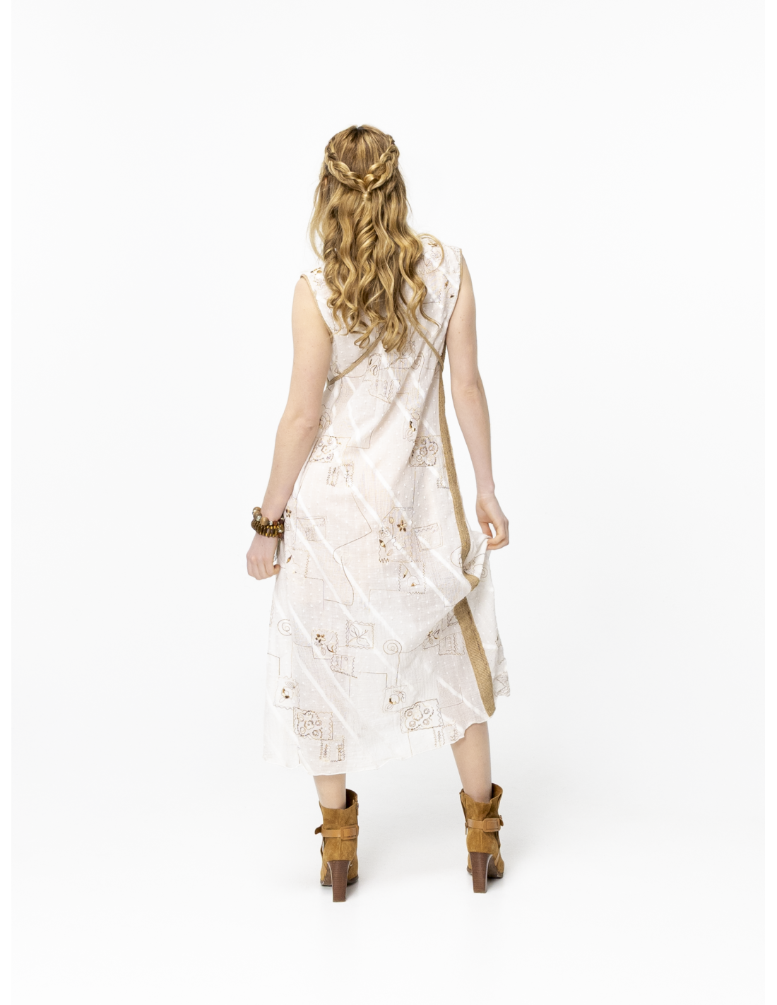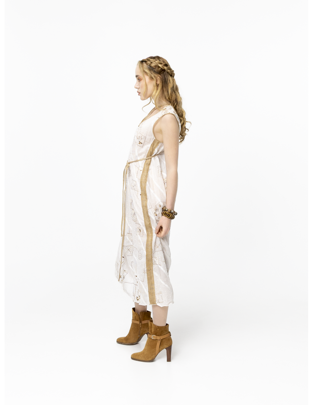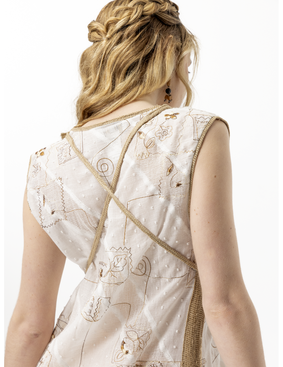 Sa broderie patchwork raffinée apporte du relief et un esprit artisanal, tandis que son décolleté rond sublime le buste avec simplicité. La ficelle amovible en lin brut, placée sous la poitrine, permet d’ajuster la taille et de structurer la silhouette selon vos envies.