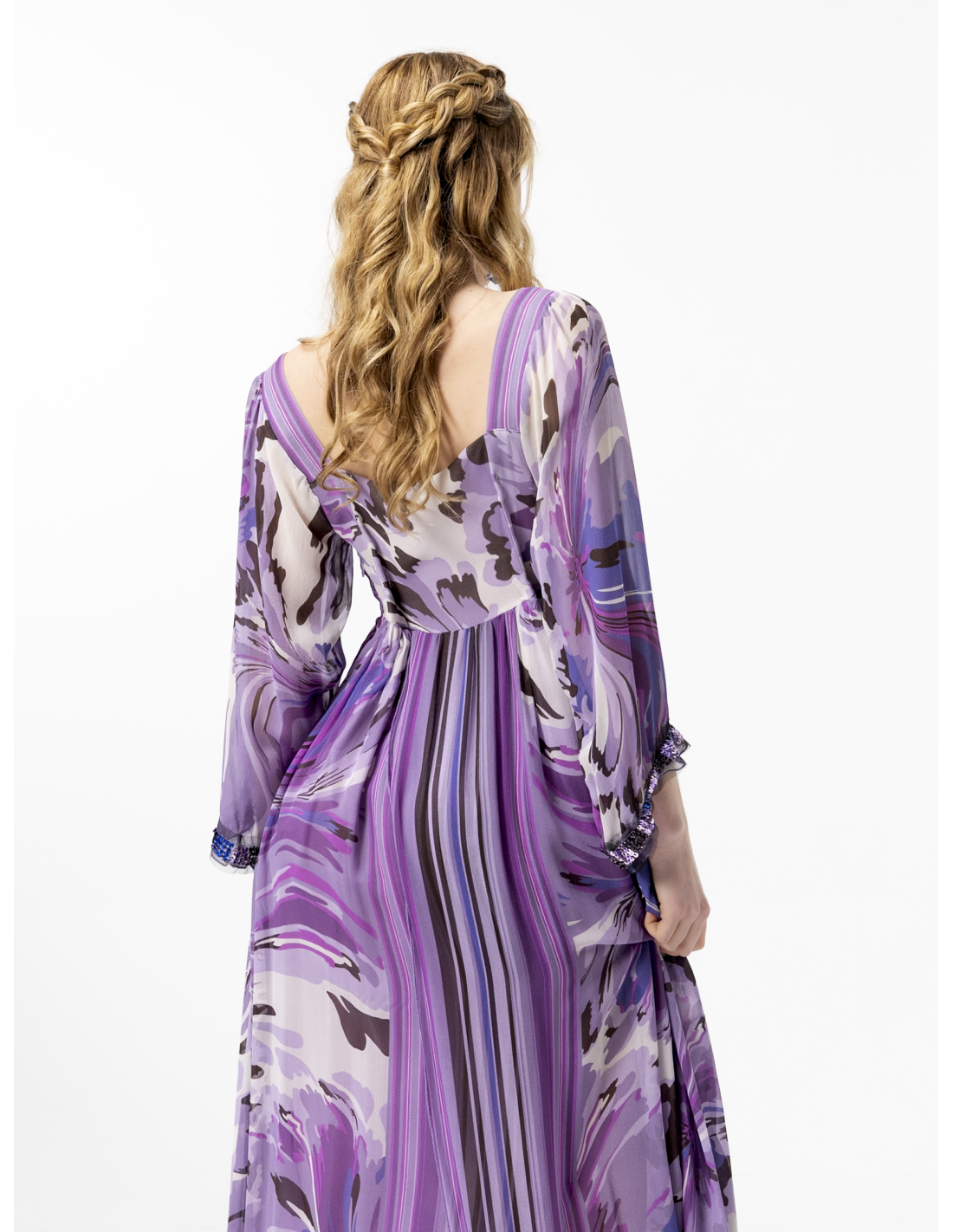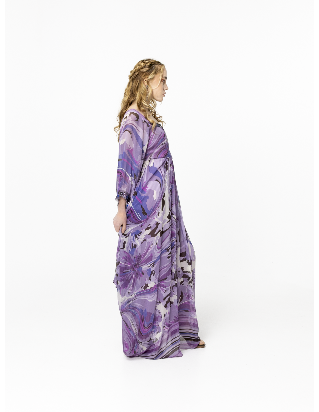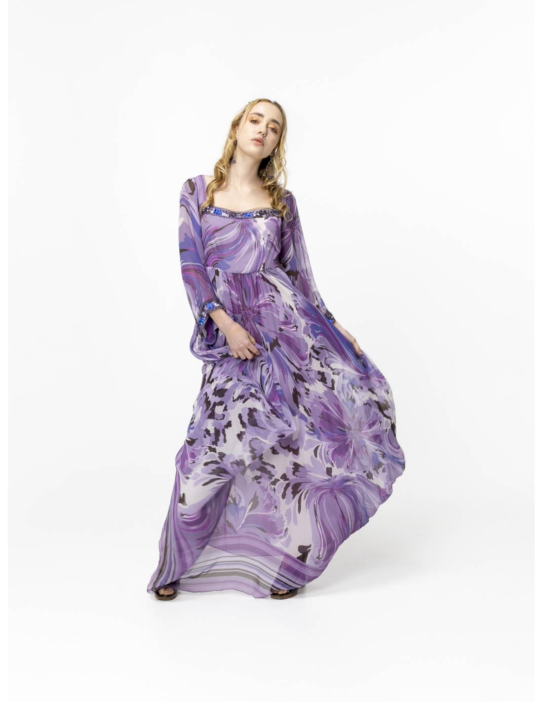 Succombez au charme intemporel de la robe longue Abelle, une création d’exception en crêpe georgette de soie lilas à imprimé floral. Inspirée de l’esthétique de la Renaissance italienne, cette robe se distingue par son élégant décolleté carré à l’avant comme au dos, ainsi que par ses manches amples 3/4 qui apportent une allure à la fois sophistiquée et aérienne.