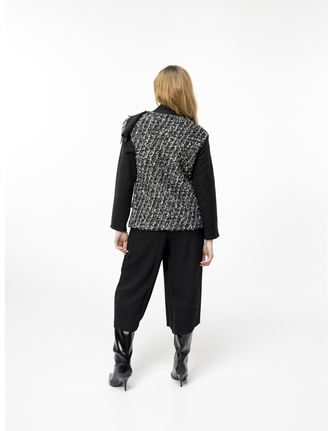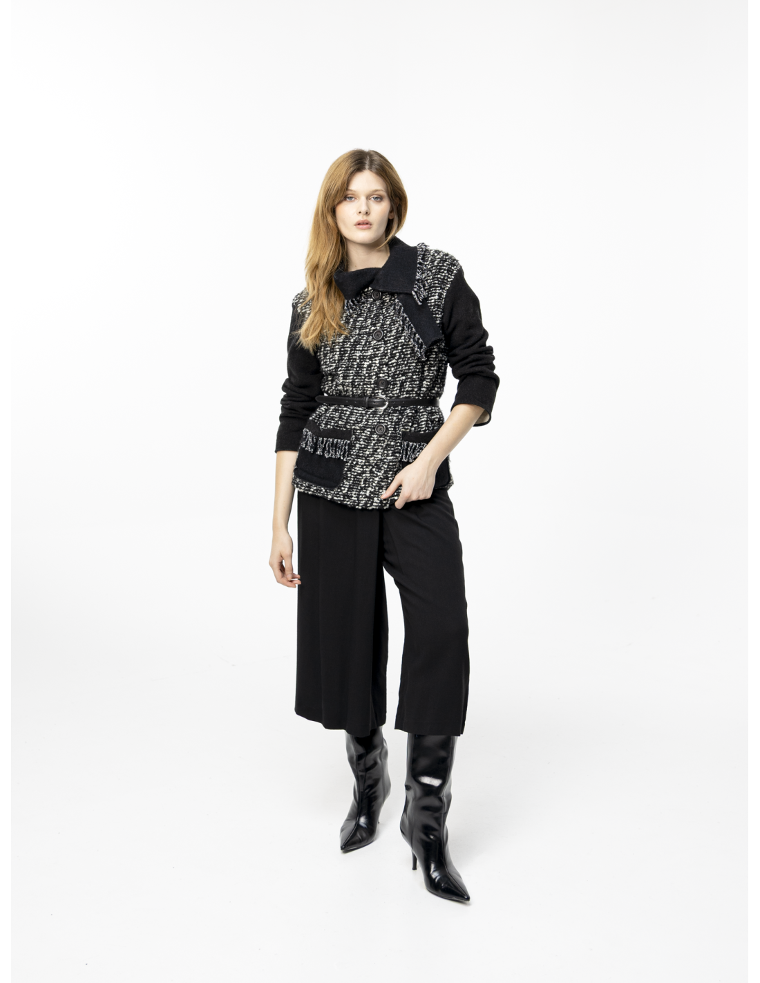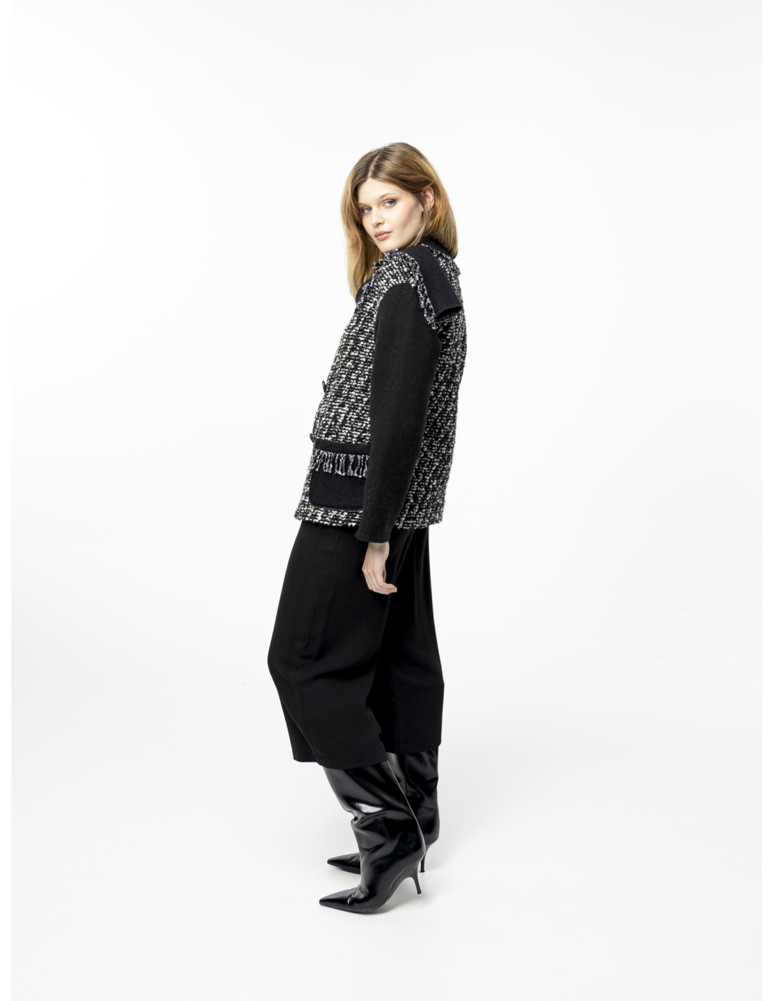 Ce cardigan veste en maille de laine noir et blanc charme par son col asymétrique à franges esprit écharpe et ses poches coordonnées.